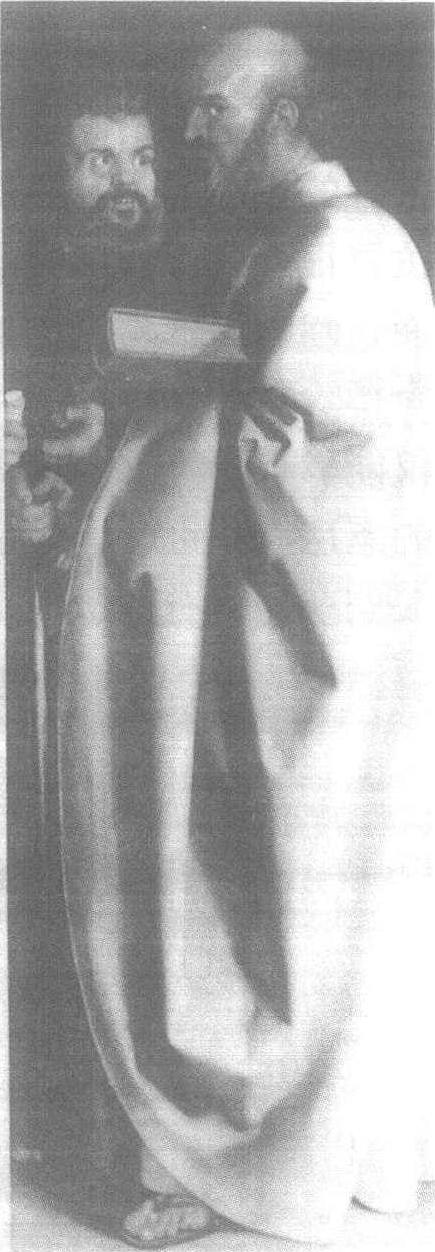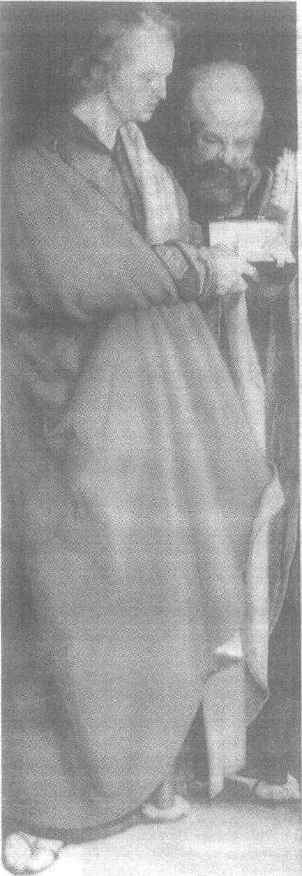四使徒 丢勒 德国画家丢勒(1471—1528)的理想人体研究,大体上是在继承了古代遗产的意大利人的基础上起步的。他成了阿尔卑斯以北最早摹仿意大利文艺复兴追求理想人体表现的艺术家。他从最初重视裸体描写到后来对理想人体的研究,都不仅仅以古代和意大利的具体作品为范本,而且还使用圆规和规尺来探求理想的比例原则。版画《亚当、夏娃与动物》就是这种尝试的代表作。这之后他经过继续深入的研究,在晚年写成了带有插图的《人体比例》 一书。 |