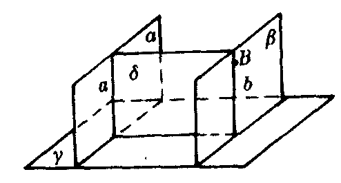 图4 证 在a内作直线a垂直于α和γ的交线. 因为α⊥γ,则α⊥γ.过α和β内任一点B作平面δ和β交于b.因为α∥β,所以a∥b.因此b⊥γ.所以β⊥γ. 以上性质主要应用在判定两条直线垂直,直线与平面垂直,或进行有关的计算方面. |