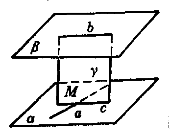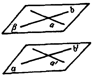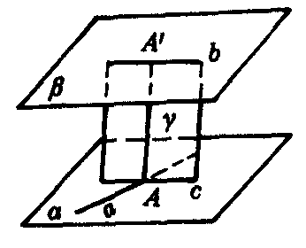 图3 例 已知a,b是两条异面直线.求证经过a而平行于b的平面,必和经过b而平行a的平面平行. 证法1 如图4,在a上任取一点M,过M和b作平面γ,则γ与a相交,设交线为c.因为b∥a,所以b∥c.因此c∥β,又因为α∥β,且a∩c=M,所以α∥β. 证法2 如图5,设AA′为a,b的公垂线,过AA′和b作平面γ与a交于c.因为b∥a,所以b∥c.因为AA′⊥b,所以AA′⊥c.又AA′⊥a,a∩c=A,所以AA′⊥α.同理可证AA′⊥β,于是α∥β.