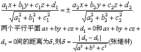 如果平面的方程是向量形式,则两个平面mr ·P+dr=0 (r=1,2)相交的充要条件是m1×m2≠0;重合的充要条件是m1 × m2=0,d1m2-d2m1=0;平行的充要条件是m1×m2=0,d1m2-d2m1≠0。且当两个平面相交时,m1×m2将是交线上的一个向量。