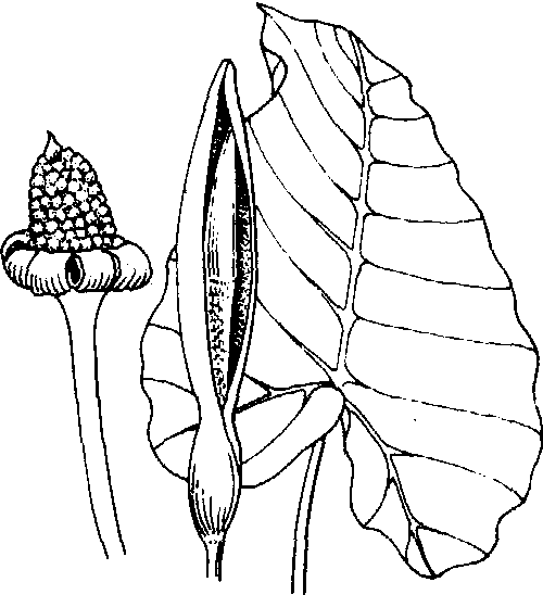 海芋全属60~70种,产于亚洲热带,常见栽培的还有:美叶芋(A.sanderiana),叶片长楔形,长30~40cm,宽约15cm,边缘有浅裂,绿色有金属光泽,叶脉白色,边缘也为白色。产于菲律宾。黑叶芋(A.×a-mazonica),由楼氏海芋(A.lowii)和美叶芋杂交而成,形态近似美叶芋,叶片长约16cm,宽约30cm,波状。 海芋giant alocasiaAlocasia macrorrhiza (L.)Schott,天南星科,海芋属。常绿大型草本。常成群生长于阴湿地方。分布广东、云南等热带、亚热带地区。有直立的地上茎和匍匐根茎。叶螺旋互生,亚革质,箭状广卵形,波状缘,叶柄粗,长达1.5m,基部鞘状抱茎。花序柄2~3枚丛生,佛焰苞下部圆筒状,上部呈舟状;肉穗花序,芳香;花序基部为白色雌花,中部下方为绿白色不育雄花,中部上方为淡黄色能育雄花,顶部为附属器;花无花被;能育雄花有3~8枚雄蕊,合生为雄蕊柱;雌花心皮3~4枚,子房1室。浆果红色。根茎药用,但有毒,慎用适量可作健胃剂,治腹痛、霍乱、疝气等有良效,根茎液汁涂患处可消肿;又为观赏植物。 |