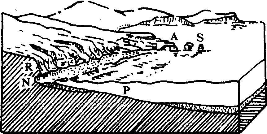 N.海蚀穴;R.海蚀崖;P.海蚀台;A.海蚀拱桥;S.海蚀柱