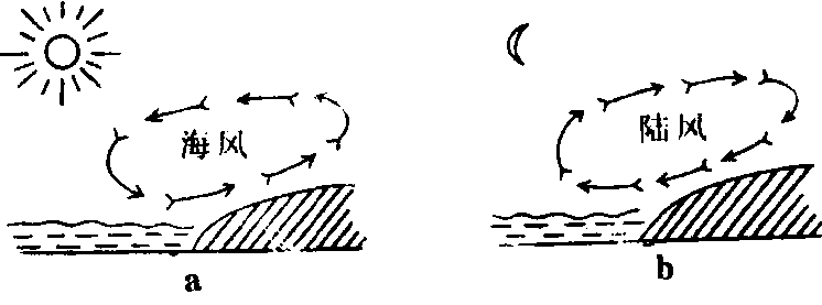 海陆风Hailufeng指海滨地区风向发生规律性日变化的风系。海陆风的产生是海面和陆面热力性质差异的结果。白天,在太阳辐射下陆面升温幅度大于海面,陆地空气受热膨胀上升的高度大于海面,以致陆面高层空气流向海洋,海洋低层空气流向陆地,在海陆之间形成一个完整的热力环流圈。夜间,陆面降温的幅度又多于海面,陆面温度低于海面,结果陆面空气冷缩下沉,在低空流向海洋;海洋上空的空气流向陆地,海陆间形成一个同白天方向相反的热力环流圈。环流圈低层从海洋流向陆地的气流称海风;从陆地流向海洋的气流称陆风。海陆风以一日为周期转换风向,一般情况下,白天10时左右陆风转为海风,下午15时左右海风最强,以后减弱,17—20时转为陆风。由于白天陆地增温快、增温多,上下层空气交换层次厚,因而海风的层次厚、水平范围广、风速比较大;夜晚陆地降温限于近地面薄层,海陆间热力环流圈范围小、强度弱,以致陆风层次薄、水平范围减小、风速也较小。