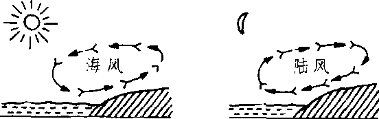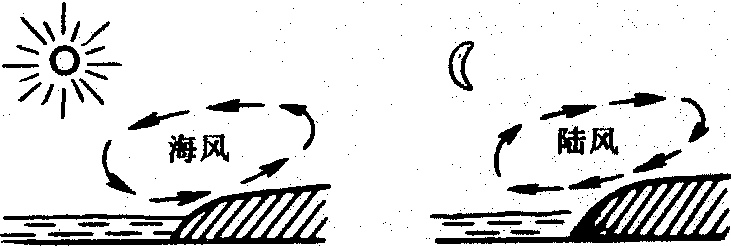 海陆风环流 海陆风海陆风是指因海洋和陆地受热不均匀而在海岸附近形成的一种有日变化的风系。在基本气流微弱时,白天风从海上吹向陆地,夜晚风从陆地吹向海洋。前者称海风,后者称陆风,合称为海陆风。海陆风的水平范围可达几十公里,铅直高度达1—2公里,周期为一昼夜。 海陆风因为海水的比热为4.0026J/(g·K), 是岩石和土壤比热的2倍,所以白天陆地升温快、温度高,晚间海洋降温慢、温度高。从而形成白天大约于9点或10点钟后风从海洋吹向陆地;晚上大约于19点或20点钟以后风从陆地吹向海洋。海陆风水平范围一般不大于100 km,高度1~2 km。 |