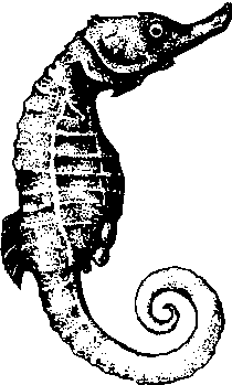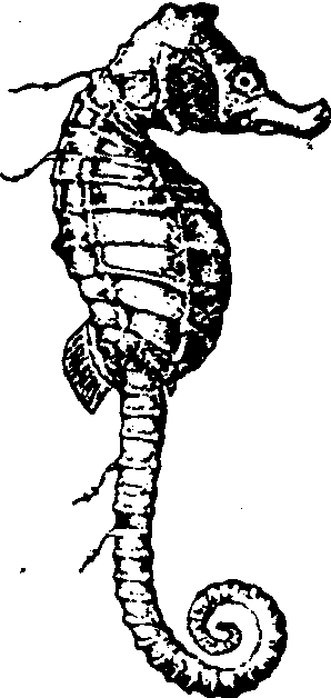 图267 海马 海马Hippocampus脊椎动物,硬骨鱼纲。体形奇特的一类小型海洋鱼类。身体侧扁,淡褐色,没有鳞片,体外包有环状骨片。一般长约5~10厘米。尾像个长管,顶端有嘴,可吸食小甲壳动物。头部弯转,与躯干成直角,很像个马头,所以称为“海马”。用鳃呼吸,鳃孔是个裂缝。由于臀鳍、尾鳍退化,又没有腹鳍,只能靠扇动背鳍和胸鳍直着身体游动。雄海马尾部的腹面有个由皮褶形成的“孵卵囊”,在繁殖时,雌海马把卵产在雄海马的孵卵囊里,卵便在孵卵囊里发育成小海马。无食用价值,但是很好的中药,有强心、健身、止痛和催产等功效,医药价值可同名药人参比美,民间流传有“北人参,南海马”的赞誉。现广东、福建已开展人工养殖海马来满足中药上的需要。