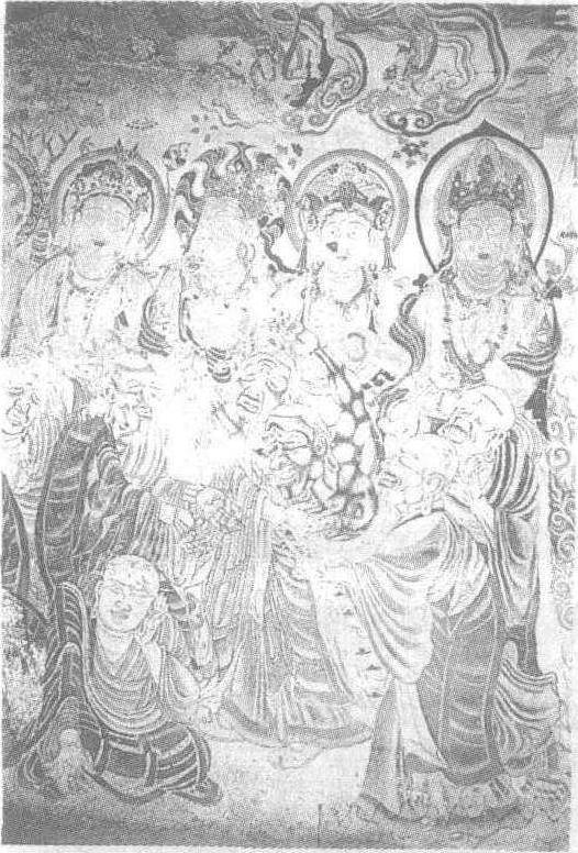 | 释义 | 涅槃经变图壁画中唐(吐蕃时代)。甘肃省敦煌县莫高窟第158窟南、北壁壁画。此窟的涅槃经变是以塑像和壁画相结合的形式来表现的。15米长的卧佛塑像背后的窟壁上满绘众弟子、菩萨、国王、王子等围绕哀悼的场面。弟子中有的捶胸顿足,有的悲泣难支,有的扑倒在佛身,有的呆坐于地似不相信这一事实。各国国王、王子也前往拘尸那城哀悼,其中包括汉族皇帝、吐蕃赞普及突厥族、中亚、南亚人。他们服饰各异,民族特征显著,或束高髻,或梳许多小辫;或戴高顶帽,或系白巾;或着大团花锦袍,或着窄袖长袍,反映出唐代各民族的关系和广泛的国际交往。他们痛不欲生,有的用刀割耳,有的以剑刺胸。正中的一排菩萨表情沉静,似已深谙佛旨,以超然出世的感情对待佛的涅槃。作者运用驾驭娴熟的画笔将释迦涅槃后各方形形色色的内心情感生动地表现出来。笔触雄浑,有些人物面部的晕染进行了夸张,给人以更深刻的印象。此图赋色艳丽,与这不平静的气氛十分相符。