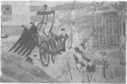 | 释义 | 涅槃经变图(阿阇世王趋车抢舍利)壁画盛唐。纵90厘米,横126厘米。甘肃省敦煌县莫高窟第148窟西壁北侧壁画。释迦牟尼在拘尸那城涅槃后火化。诸国王前来争抢舍利,甚至要以兵戎相见。摩谒陀国王阿阇世也趋车前来,此图即表现的是阿阇世坐车即将到达拘尸那城的情景。四匹壮马拉一车,车上伞盖高撑,阿阇世端坐于车内,头戴通天冠,着深衣,双手抄于身前。车前有骑马侍卫开道,车旁有头戴进贤冠的大臣和身穿裆甲,手持宝剑的武将相随。画面所采用的角度是侧俯视,这种角度的绘画不多见,它能更生动地表现一队人马紧张、快速行进的情景,具有良好的艺术效果。