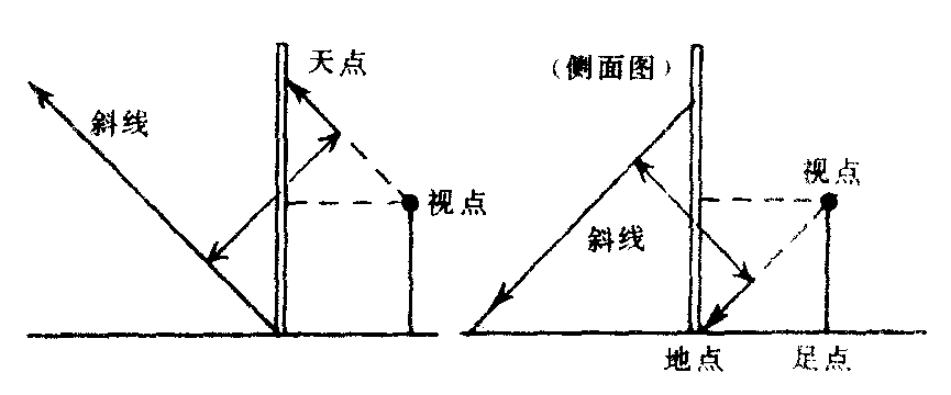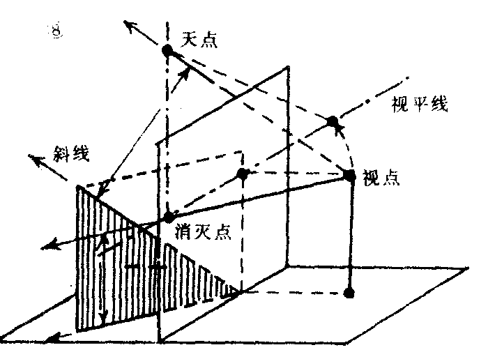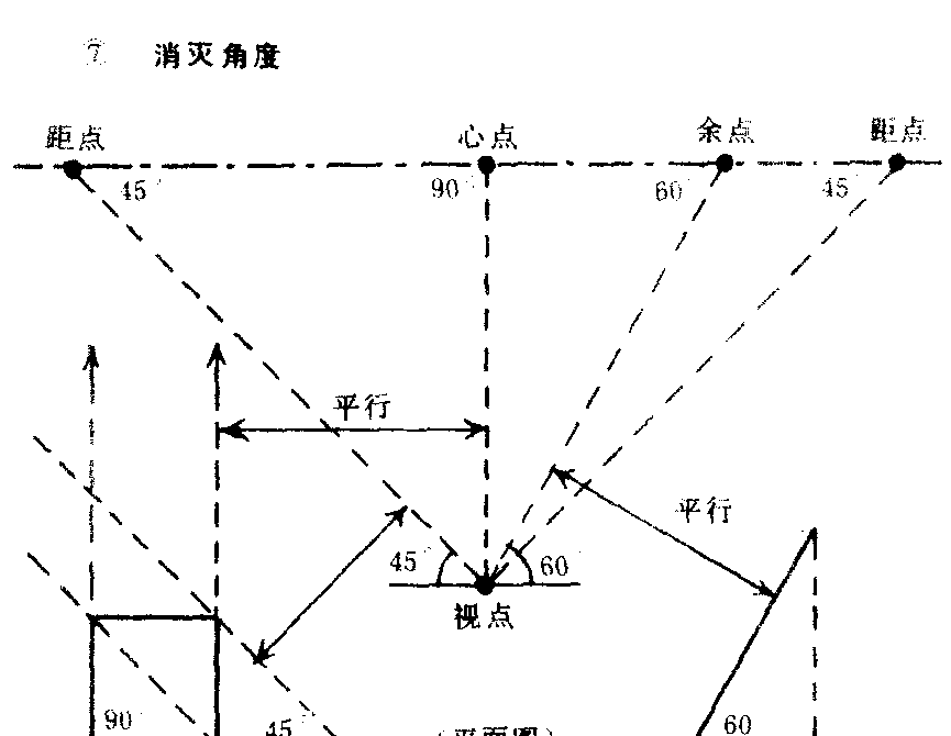 | 释义 | 消灭角度透视图上的每一条直线,因方向角度不同而消灭点的位置也不同。水平线段要从平面图中表示出与画面成何角度,再从视点作一条视线,平行于实际线段而与视平线相交,其交点便是该线段的消灭点。倾斜线段要确定与地面、画面所成的角度,先求水平方向的消灭点,再利用测点法转移视点,又在转移的视点作视线,平行于实际倾斜角度的线段,使与水平方向的消灭点的垂直线相交,此点即为天点。线段消灭角度的规律如下:❶凡与画面成90°的水平线必消灭在心点。