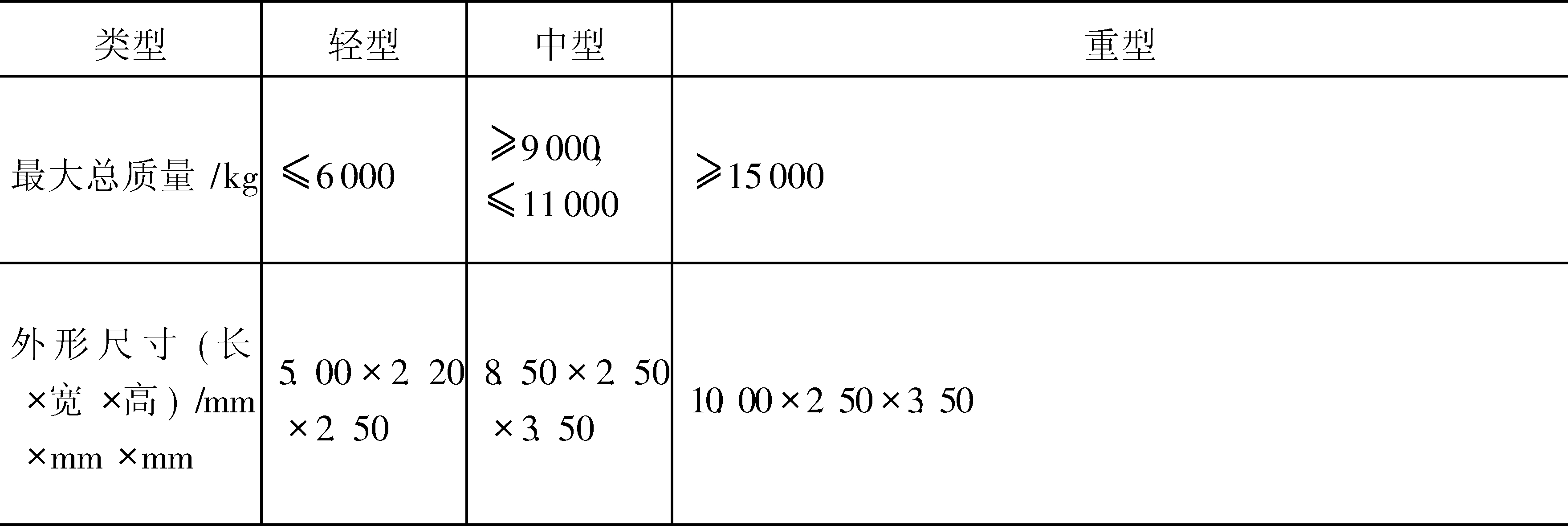 中国消防车按厂定最大总质量和外形尺寸分类方法
