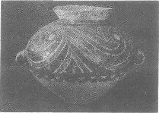 新石器时代。高33.5厘米,口径20.8厘米,底径15.9厘米。甘肃省广河县出土。北京中国历史博物馆藏。此壶为泥质红陶,手制而成。撇口、鼓腹、双耳。腹部用黑、红彩绘边缘呈锯齿状的旋转涡纹、三角纹多重,及一圈波浪纹。纹饰细腻娴熟,富韵律感。