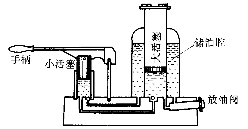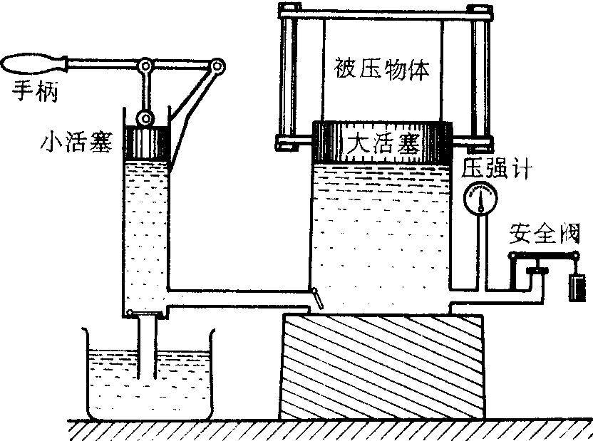 | 释义 | 液压机yeyaji以帕斯卡定律为工作原理,用来变换压力大小的液压机械。它由两个相互连通的密闭液缸和两个面积不等的活塞所组成。帕斯卡定律的提出,从理论上提供了把小的压力变换成大的压力的方法。如图1所示液压机中,大活塞压力F2、面积s2与小活塞压力F1、面积S1之间的关系为F2/F1=S2/S1。根据连续性方程有:小活塞下降大活塞上升时,小液缸中挤出液体的体积h1s1等于进入大液缸中液体的体积h2s2。可见,活塞的位移h与其面积s成反比。(h2/h1=s1/s2),与压力成反比(h2/h1=F1/F2)。后者同杠杆两端的位移与力的关系完全相似,说明液压机是一种类似于简单机械的“赢得多少力,便损失多少路程”的装置。所以液压机也可称做液压简单机械。应该注意:这里液压机内液体体积不变的要求,与杠杆不得弯曲的条件相对应。液压机内一般充有油或水。充油的叫做油压机,充水的叫做水压机。油压千斤顶是最常见的液压机,其构造如图2所示。液压机的应用很广,锻压大型钢坯可用万吨水压机,挖掘地下隧道可用液压顶管机,汽车刹车可用液压刹车系统,液压机还可用于榨油,把大型船舶由船台推送下水等许多方面。