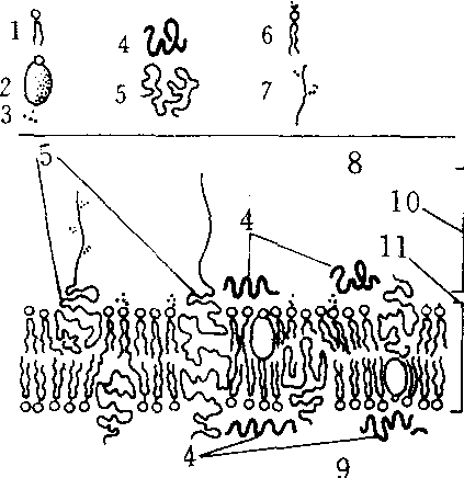 液态镶嵌模型 1.磷脂 2.胆固醇 3.多糖 4.外在性蛋白 5.内在性蛋白 6.糖脂 7.糖肽 8.细胞外环境 9.细胞基质 10. 外被层 11. 类脂双分子层 |