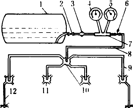 液氨施肥机流程系统图 1.液氨钢瓶; 2.开关阀; 3.过滤器;4.高压表; 5.低压表; 6.控制阀;7. 流量管; 8.总氨管; 9. 支管;10.一次分配器; 11.二次分配器;12.喷氨管 氨水施肥机主要采用重力自流式工作原理,即液肥桶中经过过滤的氨水,借本身重力和大气压力,由出液管流出,经液量调节阀、分液管、开沟器施入土壤中。 |