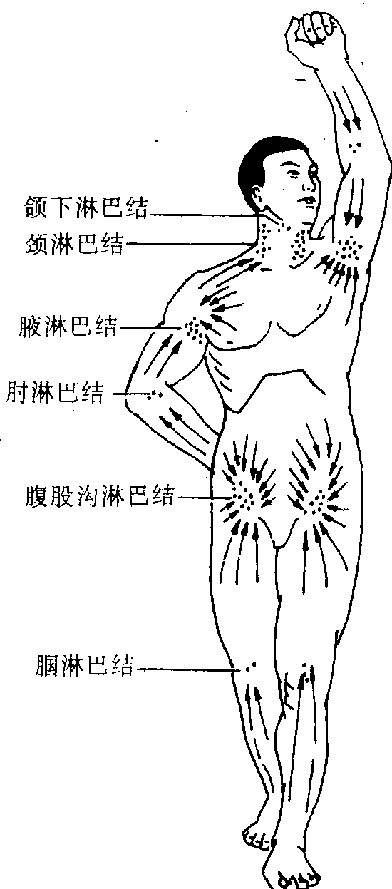 | 释义 | 淋巴循环和淋巴结淋巴液在淋巴管中运行称为淋巴循环。由于淋巴液起源于组织液,最后流入大静脉,因而认为是循环系统的一部分,是静脉的辅助机构,帮助把体液输送回心脏。此外,由于有许多淋巴结,还有制造淋巴细胞、吞食侵入体内的微生物、产生抗体等重要功能。毛细淋巴管一端为盲端,起于组织细胞间隙。一小部分组织液(包括其中的少量蛋白质)经毛细淋巴管吸收成为淋巴液,经小淋巴管、中等大小淋巴管、较大的淋巴管,最后由两支总淋巴管进入大静脉回流至心脏。淋巴管内有瓣膜可防止倒流。淋巴液在流动途中经过一系列淋巴结时均可获得淋巴细胞,由于无红细胞故为无色透明液体。但因肠道中的毛细淋巴管因可吸收脂肪滴,致使饭后大淋巴管中的淋巴液常常是白色乳糜液。淋巴结是在淋巴管行程上的无数大小不一的圆形小体,常群集在一定的部位(见图1.5-7)。淋巴结在和病菌做斗争时,本身往往肿大、疼痛甚至化脓、破溃。体内淋巴结群分别接受身体一定区域或一定器官的淋巴回流。当某处淋巴结肿大时,常提示所属区域或器官有炎症或癌肿。因而,了解淋巴结群的位置、所接受的范围、及发出的淋巴管的去向有重要的临床意义。人体具有诊断意义的淋巴结有:颌下淋巴结(位于下颌骨下方,肿大时表示口腔、鼻腔或面部有病变)、腋淋巴结(位于腋窝深处,肿大时表示上肢或乳房有病变)、腹股沟淋巴结(位于腹股沟部,肿大时表示下肢或外阴部有病变)和锁骨上淋巴结(在锁骨上凹内,肿大时表示内脏癌肿转移)。