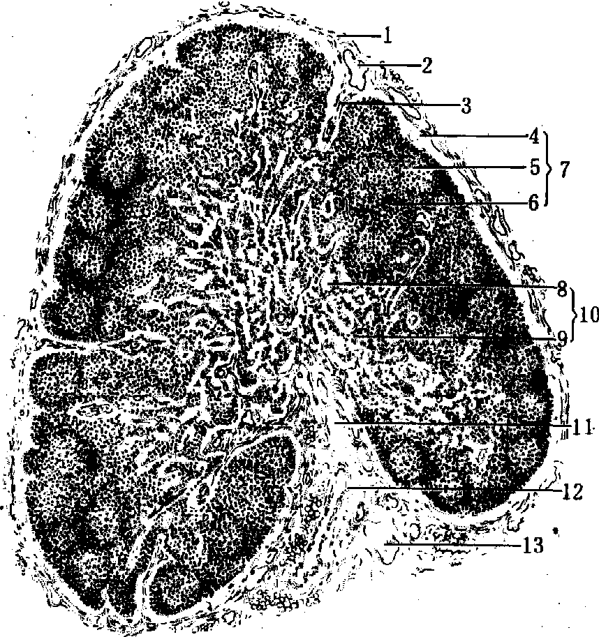 皮质 由分布于淋巴结外周部分的淋巴小结、副皮质区和皮质淋巴窦组成。❶淋巴小结。非固定结构,其大小和数量与抗原刺激有关。暗区内淋巴细胞大而幼稚,胞质嗜碱性较强,系B细胞识别抗原后转化而成。在其不断地分裂分化,并逐步转移至明区时,成为胞质嗜碱性较弱的中等大小的淋巴细胞,再经若干次分裂,则分化为帽部的小淋巴细胞,它们是浆细胞的前身、信使淋巴细胞以及B记忆细胞。浆细胞的前身可迁移至髓索,或通过淋巴回流和血液循环迁移至其他淋巴器官、淋巴组织和结缔组织中,再转变为具有分泌抗体的浆细胞; 信使淋巴细胞通过同样途径进入其他淋巴器官,继续分裂分化形成新的淋巴小结,以产生更多具有相同特异性的淋巴细胞; B记忆细胞则处于休止状态,不断地参加淋巴细胞再循环。生发中心的其他类型细胞在上述B细胞分裂分化的过程中均起重要作用,如树突细胞能聚集抗原物质,巨噬细胞除分泌白细胞介素Ⅰ,以促使T细胞转化和分化外,还能吞噬部分新形成的淋巴细胞,意义不明; T细胞则能分泌B细胞生长因子和B细胞分化因子,缺乏此二者,转化后的B细胞既不能进行分裂,也不能分化成为浆细胞。淋巴小结在失去抗原刺激后将出现一系列退行性变化,体积逐渐变小,以至完全消失。 ❷副皮质区。系淋巴小结之间以及靠近髓质的弥散性淋巴组织,为胸腺依赖区,主要由T细胞组成。在相应的抗原刺激下,可迅速分裂分化形成大量特异性T效应细胞和一些T记忆细胞,前者随淋巴回流进入血液循环到达抗原所在部位将其原地消灭,并与其直接接触,发挥其清除与排斥抗原的作用,后者则不断参加淋巴细胞重循环,起监视和识别入侵相应抗原的作用。近髓质部分的副皮质区富含毛细血管后微静脉,其内皮细胞呈立方形,基膜不完整,血液内淋巴细胞可从内皮细胞间隙或直接穿越内皮细胞进入副皮质区,并由此转移至淋巴结其他部位,因此是淋巴细胞从血液循环进入淋巴组织的重要通道。 ❸皮质淋巴窦。位于被膜下、小梁旁和副皮质区内,是一些形状不规则的淋巴窦。窦壁衬有扁平的内皮细胞,窦内有许多以细长突起彼此相连的网状细胞支撑。还有若干巨噬细胞附着于网状细胞或游离于其网眼中。 髓质 由位于淋巴结中央部位的髓索和髓质淋巴窦组成。❶髓索,为条索状淋巴组织,相互交织成网,主要含B细胞,还有许多巨噬细胞和数量变化很大的浆细胞; ❷髓质淋巴窦,穿行于髓索间,结构与皮质淋巴窦相同。 淋巴细胞再循环 淋巴细胞进入血液循环后,可从毛细血管后微静脉返回淋巴结,或转移至其他淋巴器官和淋巴组织中,并可再次进入血液,再次返回或转移,如此不断重复循环称为淋巴细胞再循环。参与再循环的淋巴细胞主要为长寿的T记忆细胞,少数为B记忆细胞。其意义在于淋巴细胞得以在身体各处不断巡行,有利于发现和识别抗原。 猪淋巴结的结构特点 输入淋巴管从一处或多处进入淋巴结,在进口处常有类似门部的不明显凹陷。输出淋巴管较多,从淋巴结表面不同部位穿出被膜、血管和神经或与其伴行,或单独进出淋巴结。淋巴小结和弥散性淋巴组织位于淋巴结中央,而相当于其他动物淋巴结髓质的结构则分布于外周,常称为周围组织。在成年猪,淋巴小结大多沿小梁分布,少数位于淋巴结外周,其帽和明区朝向小梁旁淋巴窦或被膜下淋巴窦。周围组织中“髓索”不明显,淋巴窦数量少而狭小:淋巴细胞也不甚密集。输入淋巴管进入淋巴结后,穿过周围组织直达中央区域,并与该处淋巴窦相通,后者接连小梁旁淋巴窦与被膜下淋巴窦,最后汇集于输出淋巴窦,故其淋巴流向,仍与其他动物相一致。 功能 滤过淋巴 从皮肤或粘膜进入结缔组织的细菌、异物等抗原物质经毛细淋巴管进入淋巴,并随其回流至淋巴结时,淋巴窦内巨噬细胞可及时将其吞噬和处理,故经淋巴结滤过后的淋巴中,通常细菌和异物已基本被清除而含有较多的淋巴细胞和抗体,但在淋巴结不能完成此功能时,则成为病原的繁殖场所,并为其进一步扩大感染提供有利条件。 进行免疫应答 巨噬细胞加工处理的抗原物质被识别而引起体液免疫时,淋巴结内B细胞发生母细胞化,通过迅速分裂分化,淋巴小结体积增大,数量增多,随后髓索增粗、浆细胞增多,产生抗体的能力增强。如引起细胞免疫时,T细胞同样发生母细胞化,通过迅速分裂分化,副皮质区范围扩大,产生大量特异性T效应细胞。 淋巴结linbajie淋巴系统中的淋巴组织团。呈圆形或椭圆形状,大小不一,大的像黄豆,小的似芝麻,常群集于人体凹陷隐蔽部位,如腋窝淋巴结、腹股沟淋巴结等。淋巴结的凸面有许多输入淋巴管进入,凹面除有输出淋巴管道输出外,还有血管和神经出入。淋巴结内有贮存和运输淋巴液的腔隙,称淋巴窦。淋巴结不仅能制造淋巴细胞和专门对付细菌和病毒的抗体,还能过滤淋巴液,扣留和清除淋巴液中的细菌、病毒、肿瘤细胞等,起保护人体的作用。在正常人体中,淋巴结一般是触摸不到的,如有大量细菌、病毒侵入淋巴结,或肿瘤细胞向淋巴结转移时,淋巴结可肿大或疼痛,根据肿大淋巴结的位置,能诊断病变所在的部位。如颌下淋巴结位于下颌骨下方,肿大时表示口腔、鼻腔或面部有病变;腋窝淋巴结位于腋窝深处,肿大时表示上肢或乳房有病变;腹股沟淋巴结位于腹股沟部,肿大时表示下肢或外阴部有病变。 淋巴结过滤淋巴的器