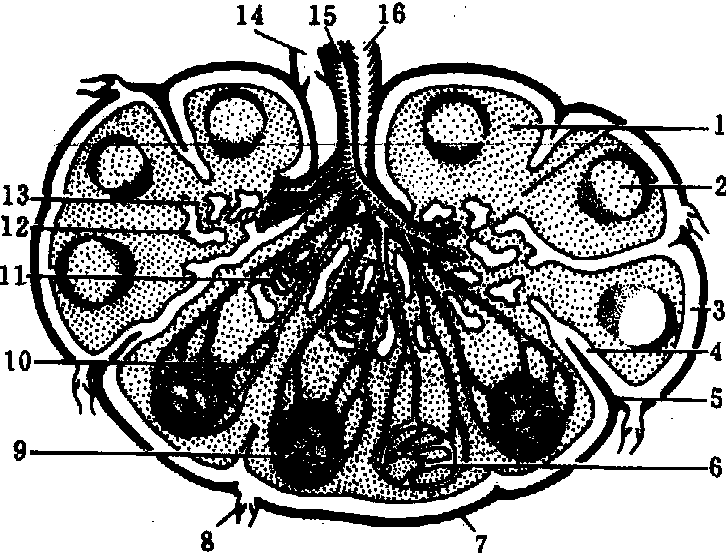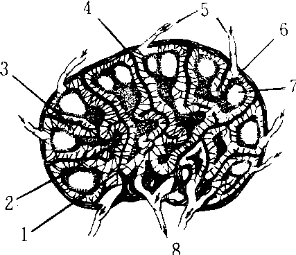 淋巴结结构 1. 髓窦 2. 髓索 3. 小梁 4. 被膜 5.输入淋巴管 6. 被膜下窦 7. 淋巴小结 8. 输出淋巴管 淋巴结淋巴管向心行程中的必经器官,直径2~20 mm,质软,色灰红。其隆凸侧有数条输入淋巴管进入,而凹陷则称淋巴结门,有1~2条输出淋巴管及血管、神经出入。 |