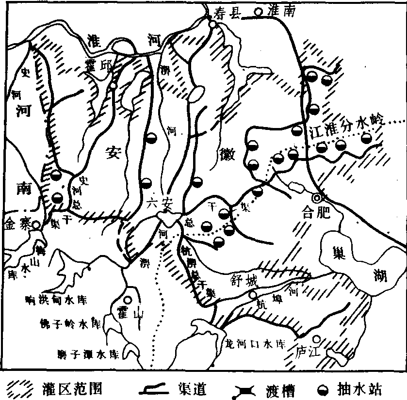 淠史杭灌区图 淠史杭灌溉工程淠史杭灌溉工程始建于50年代,是我国丘陵区最大的灌溉工程之一,也是治淮主要重点骨干工程之一。淠史杭灌区地处安徽省中、西部,跨长江、淮河两大流域,是淠河、史河、杭埠河3个毗邻灌区的总称(其中淠、杭两灌区通过淠杭干渠和杭淠分干渠相通)。灌区范围包括寿县、霍邱、舒城、金寨、六安、庐江、肥西、肥东、长丰、合肥郊区及河南的固始、商城等县(市、区)。总面积1.41万平方公里,其中皖境1.31万多平方公里,豫境977平方公里。设计灌溉面积,近期1124万亩(远景1198万亩),其中皖境1026万亩,豫境98万亩;目前实灌面积840万亩,设计灌溉保证率为80%。灌区水源有渠首以上的过境水(主要通过佛、梅、响、磨、龙5大水库调节),灌区内地面径流和淮河、巢湖等自然河湖水。 |