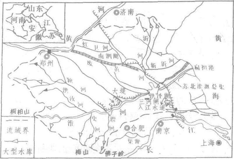 | 释义 | 淮河Huaihe我国中部的大河之一。它发源于河南省与湖北省交界处的桐柏山太白顶(又称大复峰)。自西向东经流河南、安徽等省到江苏省入洪泽湖。从河源到此处,长845公里,流域面积16.4万平方公里。洪泽湖以下,河水分两路下泄,大部分通过洪泽湖南岸的三河闸南流,过高邮湖,于江都县三江营入长江;另一部分水流过洪泽湖东岸的高良涧闸,经苏北灌溉总渠,于扁担港入黄海。从河源到入江口或入海口,大约都是1 000公里左右。流域面积跨越豫、皖、苏、鲁四省,加上历史上曾属淮河支流的沂河、沭河和泗河,共有26万平方公里。若不算原属的沂、沭、泗诸河,流域面积为18.7万平方公里。淮河从源头至豫、皖交界处的洪河口为上游,长382公里。两岸山丘起伏,河床比降较大。属山溪性河道特征。淮河源头海拔1 127米,而洪河口只有28米,平均1公里河段,高度降低2.6米。由于河床坡降大,水流湍急,支流源短,常暴涨暴落。从洪河口到江苏省洪泽湖出口处的中渡为中游。其北岸为黄淮平原,南岸为江淮丘陵,大部为霍山,是长江和淮河两大水系的分水岭。沿途在安徽省凤台、怀远、五河附近,分别切过山岭形成峡山口、荆山峡、浮山峡三段峡谷,俗称“淮河小三峡”。淮河中游集中汇入了10条重要支流,北侧的有洪河、颍河、西淝河、涡河、北淝河、濉河等,它们都沿着地面向东南倾斜的平原,平行地汇入淮河。支流与干流、支流与支流之间常形成洼地或湖泊。如南岸的城西湖、城东湖、瓦埠湖、高塘湖、花家湖、女山湖,北岸的四方湖、沱湖、无井湖及颍上的丘家湖、唐垛湖、八里湖、凤台的焦岗湖等。这些湖泊大都是以往黄河洪水泛滥侵淮时带来的泥沙,使淮河干流河床淤高,各支流下游排水困难淹没造成的。中游南侧支流的长度比北侧支流短,整个水系形成一种典型的不对称状,这就是羽状水系或梳状水系。从洪泽湖出口处的中渡到三江营或扁担港为淮河的下游。这里地势低洼,水网密集,湖泊棋布。淮河水道大都是借道湖泊,不成河形,且无较大支流注入。自1194年,黄河决口夺淮,带来大量泥沙,导致淮河下游河道淤高、堵塞,河水向低地汇流,形成了密集的湖泊群。淮河的年径流总量并不算大,如蚌埠站的平均年径流总量为257亿立方米,但各年的流量相差十分悬殊。多雨的年份可达700多亿立方米,少雨的年份只有53亿立方米,两者相差13倍多。由于淮河水系南北不对称,淮北支流较长,河道坡度平缓,具有平原河流特性;淮南支流源短流急,河道坡度大,上游具有山溪性河流特性,流域内降水时间往往比较一致,暴雨期间很快汇入干流。加之中游河道弯曲多,排洪能力小,这样就使淮河经常发生水患灾害。据不完全统计,从1662年到1722年的60年中,淮河流域平均每二年一次水灾。1746—1796年的50年及1844—1881年的37年中,平均每三年一次水灾。1916—1931年的15年中有4次水灾。淮河流域2亿亩耕地,经常受灾的就有1.3亿亩。中华人民共和国成立后,淮河流域人民开展了治理、改造淮河的伟大斗争。40多年来,按照上游以蓄为主、中游以疏导和固堤为主、下游以泄洪和排涝为主的方针,先后在淮河干支流上修建了30多座大型水库和4 100多座中小型水库;在上游广大山地丘陵地区,大力开展水土保持工作;在淮河中游支流史河、淠河和长江支流杭埠河,修建了以灌溉为主的淠、史、杭大型工程,灌溉农田面积达1200万亩;在淮河下游,大力新辟入海、入江行洪水道。如从高良涧到扁担港、长170公里的苏北灌溉总渠(汛期可分洪700立方米/秒的洪水),从三河到高邮湖、长18公里、宽3公里的引洪道,从洪泽湖向北新开挖的淮沐新河,从苏北射阳湖向东北开挖的黄沙港等。此外,在扬州以东还兴建了规模巨大的江都水利枢纽工程。