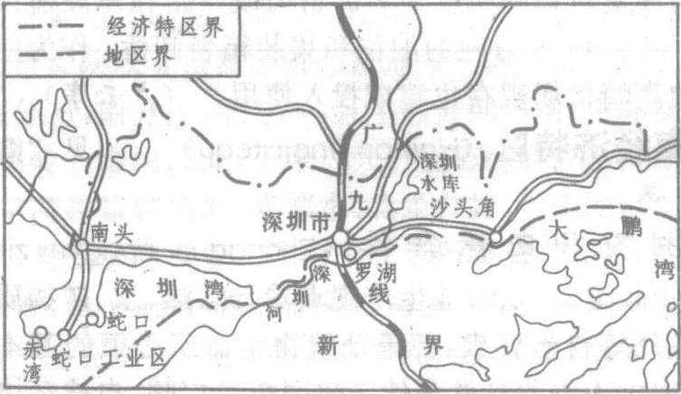 深圳经济特区示意图 深圳经济特区位于广东省深圳市,是我国起步最早、规模较大的一个特区。深圳经济特区南临香港新界,东濒大鹏湾,西接珠江口,北傍梧桐山和举白山脉,东西长49公里,南北宽7公里,总面积达320多平方公里,其中可供规划城市建设的土地约90多平方公里,余为山地,总面积比香港、九龙地区大一半。现有人口30万左右。根据特区建设规划,特区的腹地是罗湖商业区,西部是蛇口工业区,东部是深圳水库,大小梅沙风景旅游区和住宅区。深圳特区是以工业为重点,兼营商、农、牧、住宅、旅游等多种行业的综合性的经济特区。 |