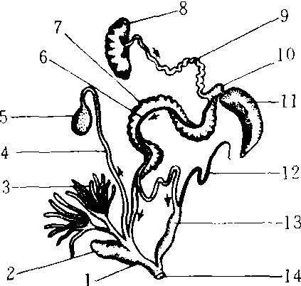 蜗牛的生殖系统 1.阴道 2.矢囊 3.黏液腺 4. 交配囊管 5. 受精囊 6. 输卵管 7.输精管 8.两性腺 9. 两性管 10. 储精囊 11. 蛋白腺 12.鞭状体 13.阴茎囊 14.生殖孔 |