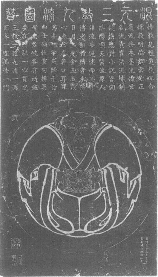 | 释义 | 混元三教九流石刻线画明嘉靖四十四年(公元1565年)。长110厘米,宽63.5厘米。河南省嵩山少林寺藏。图分上下两部分:上部,以楷书体刻“混元三教九流图赞”。下部分,在一大圆圈内,刻一左右髻各戴儒冠,道冠,眉间饰白毫相,髭须中分下垂,着右衽宽袖大袍老者。他耸肩缩首将身体藏在肥大的衣服中,团成一团,双手捧卷于胸前展开,睁大眼望着前方。展开的卷轴部分,九条弯曲的水流从四面的波浪中分离出来,不约而同地汇向中心,结为一体,形成一朵团花。老者面相、卷轴分别寓三教(儒、道、佛)一体,九流一源之意。左下角有“嘉靖乙丑三月吉日寓南赡部州狂仙书”16字。此图构思巧妙,表现手法独特,是明代中叶统治者提倡的释、道、儒合一的统治思想的具体表现。