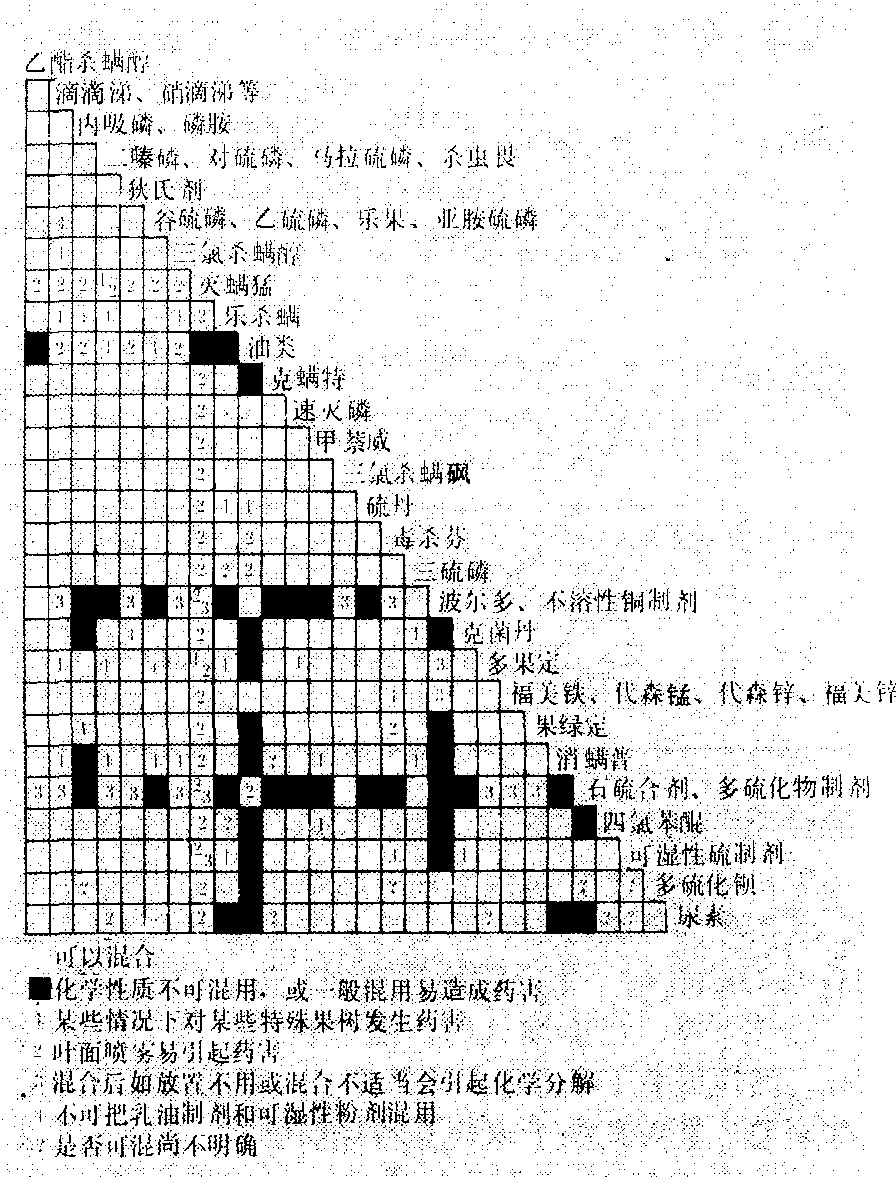 混用方法 各种农药制剂加入水中时均有一稀释分散过程。但乳油制剂在水中从均一的油溶液分散成为乳浊液,历程比较复杂。用其他剂型同乳油制剂混合使用时,原则上应先配制乳油制剂的喷雾液,在形成稳定的乳浊液以后再加入其他混用药剂。充分搅拌是混合使用的重要条件,主要是使农药制剂中所含的助剂能迅速扩散均匀,以防止农药的微粒发生凝并而影响喷雾液的质量。所以在药液槽中配制时,加入水后应先开动搅拌桨,然后依次加入所需用的药剂。对于小型喷雾机具,应先在药液制备槽中配制,然后分装到喷雾器中使用。 |