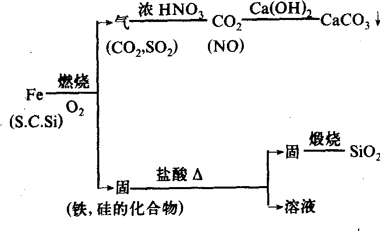答 混合气体总体积是 10.08L,其中含氢气2.24L,一氧化氮1.12L,二氧化氮6.72L。 ❹ 采用气体分析法,将混合气体依次通过吸收剂,使各组分依次吸收,在相同温度和压力下测得每次吸收后体积的减少,就是所吸收气体的体积。 例 为测定铁里碳.硅.硫的百分含量,使10g样品在氧气中充分燃烧,并将生成的气体冷却,测定其体积在标准状况下为567cm3 (不含氧气),再使混合气先通过浓硝酸,再通过澄清的石灰水充分吸收,将生成的白色沉淀滤出后干燥,称其质量为2.5g。将燃烧后生成的固体加盐酸并煮沸,溶解后过滤,滤出的残渣经煅烧,冷却,称得质量为0.75g,试计算生铁里的碳、硅、硫的百分含量各是多少? 分析 按题意,铁经充分燃烧后,各元素可生成高价氧化物(硫只能氧化成+4价) S+O2=SO2 C+O2=CO2 Si+O2=SiO2 4Fe+3O2=2Fe2O3由此分成两部分——气体和固体。燃烧生成的气体通过浓硝酸时,二氧化碳不反应,二氧化硫被氧化: SO2+2HNO3=H2SO4+2NO2↑ CO2+Ca(OH)2=CaCO3(白色,↓)+H2O 燃烧生成的固体 二氧化硅和三氧化二铁可结合成Fe2O3·2SiO2或Fe2(SiO3)3等形式。铁、硅的化合物在盐酸中溶解并生成胶状固体颗粒。据上,可图解为: