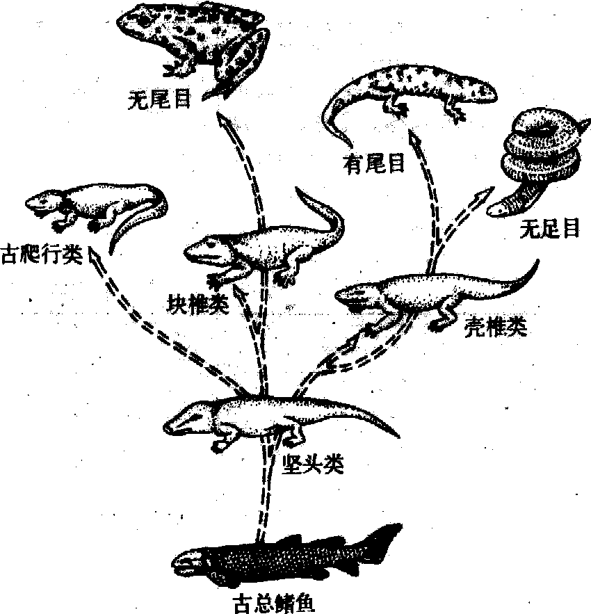 两栖纲演化图 特征 主要是具备五趾型的肢骨和带骨,开始出现一枚颈椎,并有一枚荐椎与腰带骨相连,支持身体使之能在陆地运动; 头骨由2枚枕髁与颈椎相连。皮肤表面裸露,而且是本纲动物重要的辅助呼吸器官。皮肤腺发达,皮下有丰富的血管,大量的分泌物可使皮肤在干燥的空气中保持湿润,防止体液过分蒸发,有利于皮肤呼吸。与肺和皮肤呼吸有关的是心脏分为二心耳,一心室。右心耳接纳全身回心的静脉血,左心耳接纳自肺回心的动脉血; 由于心室尚未分隔,动脉血与静脉血在心室内呈现部分混合,故属不完全的双循环。它导致动脉血液中的含氧量不充分,影响组织细胞中物质的氧化效率不能产生足够的热量,加以缺乏良好的保温条件和完善的体温调节机制,因此体温不能维持恒定,在很大程度上随环境温度而变化,故称为变温动物或外热源动物。每当严寒酷暑或干旱季节,均需进行蛰眠。通常,同种的许多个体常聚集在同一地点冬眠,既有利于维持略高的体温和保持一定湿度,也有利于出蛰后雌雄两性的觅偶和交配。春末夏初出蛰后,即在冬眠地附近的水域中产卵,受精卵于水中发育成幼体。由于两栖动物尚未彻底摆脱对水环境的依赖,所以还不能说是真正的陆生动物。 生长发育 除一部分蝾螈营体内受精外,绝大多数两栖动物虽有抱雌行为,但都是体外受精。受精卵的发育经过卵裂期、囊胚期、原肠胚期、神经胚期等阶段,待胚胎生长发育到一定时期,即穿越卵黄膜和胶膜而成为蝌蚪。蝌蚪生活于水中,呈鱼形,以尾游泳,最初以两对外鳃进行呼吸,俟后改由4对内鳃代替其作用; 心脏分一心耳,一心室,单循环; 口的上下唇有角质细齿,借此啃食植物; 肠管有盘曲。经3个月的生长,长出四肢,全身开始蜕皮,唇上的角质细齿和表皮也一起蜕脱;食物由植物性逐渐转变为动物性,肠随之相应缩短; 尾渐萎缩,直至完全消失; 肺越来越发达,鳃则日趋退化,最终由肺完全代替了鳃。蝌蚪经变态而成幼蛙(蟾),离水上陆营两栖生活。两栖类的变态过程,充分表明个体发育同种族发生的密切关系,简要地重现了两栖纲动物是由水栖的鱼形动物发生演化而来的经历,是生物发生律的最好实例。 分类 现存的两栖纲动物仅包括无足目(Apoda),有尾目(Caudata)和无尾目(Anura),约有3 000种。无足目动物的身体细长似蚯蚓,故又名蚓螈目; 体表有窄密的横沟,沟内有细鳞,尾极短,不明显; 雄体有交接器,体内受精,卵生或卵胎生; 穴居地下,以昆虫和蠕虫等为食。全世界约有170种,分布在非洲和热带亚洲、美洲,中国云南、广东、广西等省区产1种版纳鱼螈(Ichthyophis bannanica)。有尾目动物身体分为头、躯干和尾三部。头大,无鼓室和鼓膜,上下颚密生一列细齿,也有排列形式不一的犁骨齿; 躯之两侧常有许多肋沟,四肢细弱或缺少后肢; 尾发达而侧扁; 大多为肉食性动物,主要凭嗅觉捕食无脊椎动物和小形的鱼、蛙等。现知有尾目动物约250种,大多分布在北半球,只有少数种类往南分布到热带区域。中国产3科、约30种,常见的有大鲵(Megalobatrachusdavidianus)、小鲵(Hynobius)、巴鲵(Liua shihi)、蝾螈(Cynops orientalis)、肥螈(Pachytriton)、疣螈(Tylototriton)和瘰螈(Paramesotriton)等。无尾目是本纲中最高等、种类最多和分布最广的一个类群;体形短宽,四肢发达,后肢强大适于跳跃和游泳; 皮肤腺丰富,常形成背侧褶或集中而变为耳后腺、疣粒;鼓膜明显; 除少数种类外,舌前部游离,可翻出捕食昆虫; 体外受精,卵生,发育过程需经由蝌蚪变态为幼体的阶段。无尾目现有2 500种左右,分布遍及各大洲,中国约有180种,西南诸省所产种类最多,常见的有盘舌蟾科(Discoglossidae) 的铃蟾 (Bombina orien-talis);锄足蟾科(Pelobatidae)的角蟾(Megophrys)和髭蟾(Leptobrachium);蟾蜍科的大蟾蜍(Bufo gar-garizans)、花背蟾蜍(B.raddei)和黑眶蟾蜍(B.me-lanostictus); 雨蛙科 (Hylidae) 的无斑雨蛙(Hylaarborea immaculata)、中国雨蛙(Hyla chinensis);蛙科(Ranidae)的弹琴蛙(Rana adenopleura)、黑斑蛙(R.nigromaculata)、泽蛙(R.limnocharis)、日本林蛙(R. japonica)、金线蛙(R.plancyi)、中国林蛙(R.chensinensis)、虎纹蛙(R. tigrina); 树蛙科( Rha-cophoridae) 的大树蛙(Rhacophorus dennysi)和峨嵋树蛙(R.omeimontis);姬蛙科(Microhylidae)的狭口蛙(Kaloula)和饰纹姬蛙(Microhyla ornata)等。