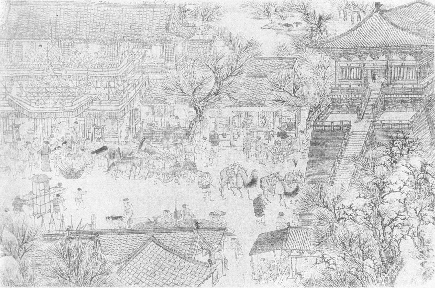 清明上河图北宋画家张择端作。描绘了北宋都城汴梁(今河南开封),清明时节从城郊到城内街市繁华热闹的市俗人事。画面的内容大体可分为三段:首段是城郊风光;中段是以拱桥为中心描绘汴河两岸繁华而又闲适的景色,是全图的中心;后段描写汴梁街市的实况。从商业、交通、漕运、建筑等几个角度,集中地再现了当时社会的生活面貌和风俗习尚。现藏故宫博物院。 清明上河图宋·张择端作。绢本设色,纵24.8厘米、横528.7厘米长卷,现藏故宫博物院。画卷描绘北宋首都汴梁(今河南开封)汴河两岸物阜民丰繁荣热闹的景象。画卷右边以村郊田野村落开端,赶集人和驮运的骡马从田间小路向城里集中,路旁树木萌发现出北国早春的气息。人流穿过丛丛苍劲老树,来到街道,水波激荡的汴河出现在画卷上,成为画卷中的主题,并沿汴河展开。运货舟船过拱桥是精采的一幕,岸上纤工俯身前行,准备驶过拱桥的木船,船桅已放倒,船工握篙盘索,各个紧张忙乱神态逼真;桥上人群挥臂助阵,喧呼嘈杂;行人聚集桥头围观,形成画卷中第一个高潮。那些赶脚、推车、挑担的人们,自无暇一顾,急忙过桥前往,穿街进城,来到热闹地段。城里车马行人摩肩接踵,酒楼店铺百肆杂阵,各色居住人等,表现出“百家技艺向春售,千里农商喧日昼”的繁华景象,形成画卷中第二个高潮。画上仕农工商、僧道卜医、男女老幼神态各异,官府篇宅、酒店茶楼、驼马舟车形式多样。从十字街头再往前,画到临近汴京中心而止,给人留有余思。此画卷除了具有艺术价值以外,还给后人留下许多历史资料,对研究宋代城市生活、工商交通、风俗、服饰、建筑等等很有价值。是一幅形象突出、含义丰富的千古杰作。