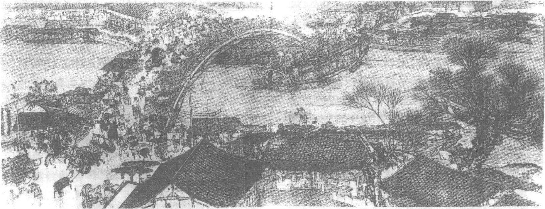 清明上河图(局部) 《清明上河图》《清明上河图》 是北宋张择端作,绢本,淡设色,长528.7厘米,高24.8厘米。描写北宋首都汴梁 (今河南开封),汴河西岸 “物阜民丰” 的繁荣景象。横长的构图,展现了郊野、汴河及街市的景色。画卷右边开端处,是宁静的田野和村落,赶集的乡人和驮运的骡马在田间小路上渐次向城里集中。那些开始萌发枝芽的树木调节了画面的色彩和疏密,又表现出北国早春的气息。穿过一些苍劲的老树,来到城郊的街道,人们正在从停泊在河边的粮船上搬下沉重的粮袋。水波荡漾的汴河开始出现在画面上,它渐次成为画幅中的主体,一切活动都沿着汴河展开。我们看到的是市井繁盛,升平乐业的景象。拱桥横跨汴河两岸,河边的舶岸船只上的舟人生活悠闲自在,最为引人注目的是那艘准备驶过拱桥的木船,船桅已经放倒,船工握篙盘索。船上呼叫接应,岸边挥臂助阵。过往行人聚集桥头围观这紧张的一幕。而那些赶脚、推车、挑担的人们,自无暇一顾,因他们各自有谋生的重担在身。过桥往前,河上船只逐渐远去。穿街入城,来到画卷最热闹的地段。这里车马行人摩肩接踵,熙熙攘攘,茶楼酒肆、官府民居鳞次栉比,百货俱存,正是 “百家技艺向春售,千里农商喧日昼”。画上仕农工商、僧道卜医、男女老幼神态各异,官府宅第、驼马舟车具体而微……从十字街头再往前去,似将临近汴京中心,但画卷到此戛然而止,给观者留下了充分想象的余地。整幅画卷的结构宛如一首弱起强收的乐曲,以轻柔的乐段开始,几经跌宕起伏,层层展开,推向高潮,然后在热烈的气氛中结束。而贯穿全曲的主题,则是对太平时期汴梁生活的赞美和怀念。全图共画人物550个,包括男女老幼、士农工商,神情各异。还画了驴、马、牛、骡、骆驼等各类牲畜60余匹,车轿20多乘;船舳20余艘,楼屋农舍30余栋。这是具有纪实价值的历史风俗画卷,多侧面地反映了中国北宋时代城市生活的面貌,为研究中古历史文化提供了形象资料,同时又具有颇高的艺术价值。作者以精湛的绘画功力,写人状物,无不刻画精微。此图曾经北宋、金、元、明、清几代公私鉴赏,清嘉庆四年 (1799) 入藏清内府。1911年被溥仪携出故宫,抗战胜利后,在长春机场为人民解放军发现,现藏故宫博物院。 《清明上河图》《清明上河图》是北宋张择端作,绢本,淡设色,长528.7厘米,高24.8厘米。描写北宋首都汴梁(今河南开封),汴河西岸“物阜民丰”的繁荣景象。横长的构图,展现了郊野、汴河及街市的景色。画卷右边开端处,是宁静的田野和村落,赶集的乡人和驮运的骡马在田间小路上渐次向城里集中。那些开始萌发枝芽的树木调节了画面的色彩和疏密,又表现出北国早春的气息。穿过一些苍劲的老树,来到城郊的街道,人们正在从停泊在河边的粮船上搬下沉重的粮袋。水波荡漾的汴河开始出现在画面上,它渐次成为画幅中的主体,一切活动都沿着汴河展开。我们看到的是市井繁盛,升平乐业的景象。拱桥横跨汴河两岸,河边的舶岸船只上的舟人生活悠闲自在,最为引人注目的是那艘准备驶过拱桥的木船,船桅已经放倒,船工握篙盘索。船上呼叫接应,岸边挥臂助阵。过往行人聚集桥头围观这紧张的一幕。而那些赶脚、推车、挑担的人们,自无暇一顾,因他们各自有谋生的重担在身。过桥往前,河上船只逐渐远去。穿街入城,来到画卷最热闹的地段。这里车马行人摩肩接踵,熙熙攘攘,茶楼酒肆、官府民居鳞次栉比,百货俱存,正是“百家技艺向春售,千里农商喧日昼”。画上士农工商、僧道卜医、男女老幼神态各异,官府宅第、驼马舟车具体而微……从十字街头再往前去,似将临近汴京中心,但画卷到此戛然而止,给观者留下了充分想象的余地。整幅画卷的结构宛如一首弱起强收的乐曲,以轻柔的乐段开始,几经跌宕起伏,层层展开,推向高潮,然后在热烈的气氛中结束。而贯穿全曲的主题,则是对太平时期汴梁生活的赞美和怀念。全图共画人物550个,包括男女老幼、士农工商,神情各异。还画了驴、马、牛、骡、骆驼等各类牲畜60余匹,车轿20多乘;船舶20余艘,楼屋农舍30余栋。这是具有纪实价值的历史风俗画卷,多侧面地反映了中国北宋时代城市生活的面貌,为研究中古历史文化提供了形象资料,同时又具有颇高的艺术价值。作者以精湛的绘画功力,写人状物,无不刻画精微。此图曾经北宋、金、元、明、清几代公私鉴赏,清嘉庆四年(1799)入藏清内府。1911年被溥仪携出故宫,抗战胜利后,在长春机场为人民解放军发现,现藏故宫博物院。 《清明上河图》中国古代绘画作品。宋代张择端作。卷式,绢本,淡设色,24.8cm×528.7cm,故宫博物院藏。全卷分3段,画有人物550余人,牲畜50余,船20余只,车轿20余乘,各色建筑物100余座。画上有后世收藏印67方。展现了12世纪中国都市各阶层人物的生活状况和社会风貌。 《清明上河图》见“张择端”。 清明上河图卷水墨淡彩绢本。宋代张择端绘。高24.8公分,长528.7公分。描写北宋年代(960—1127)东京汴梁城人情物态。展示了当时的经济面貌、城乡交流和民情风俗。画的结构大体分为三段:首段是京郊的农村风光;中段是以拱桥为中心的汴河及其两岸的运输和贸易的忙碌情景;后段是城门内外街市的繁华景象。画卷中共画人物550个,50多头牲畜,20多艘船只,各种样式的房子30余栋,是我国古代规模最大的风俗画,也是一幅高度现