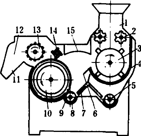 图1 锯齿辊筒式籽棉清理机 1.盛花斗; 2.喂花辊;3.松花辊筒; 4.排杂网; 5.排杂螺旋;6.端板; 7.钢丝刷条; 8.排杂调节板; 9.小锯齿辊筒;10.大锯齿辊筒; 11.消花板; 12.出花口;13.毛刷辊筒; 14.拨花辊;15. 导向板 锯齿辊筒直径一般为250~600毫米,线速度3~5米/秒,毛刷辊筒的线速度约为锯齿辊筒的1.5~2倍。籽棉清理机的生产率则由幅宽确定。 重杂物沉积器 有离心式和圆筒式两种,主要用于清除重杂,一般设置在籽棉清理机前面的输棉管道中。离心式重杂物沉积器是一个带垂直叉管的90°弯管。过弯管时,重杂物坠落在叉管活门上,当配棉管道中风门关闭,活门自动打开,重杂物落到叉管底板上,积到一定数量时,打开底板取出。 皮棉清理机 常用的有锯齿辊筒式和气流式两种类型,主要用于清理前道工序未清除的和因轧花过程中产生的细小杂质。这些杂质影响棉纱的强力和外观质量。气流式和锯齿式皮棉清理机工作宽度与轧花机相近,处理量相匹配。机摘棉轧花后皮棉含杂率经过两次清理后一般可由4~6%降到2~4%。 气流式皮棉清理机 使皮棉在压力为490~622帕的高速气流下进入机器的输棉管道,管道在拐弯处断面缩小,并开有喷口,使皮棉内较重的杂质在惯性作用下,从喷口喷出,落在杂质收集箱内,由螺旋输送器排出;皮棉则继续沿管道向前。喷口喷出的杂质量可由调节板控制。气流式皮棉清理机无转动部件,不损伤棉纤维,但清杂效率低于锯齿式。