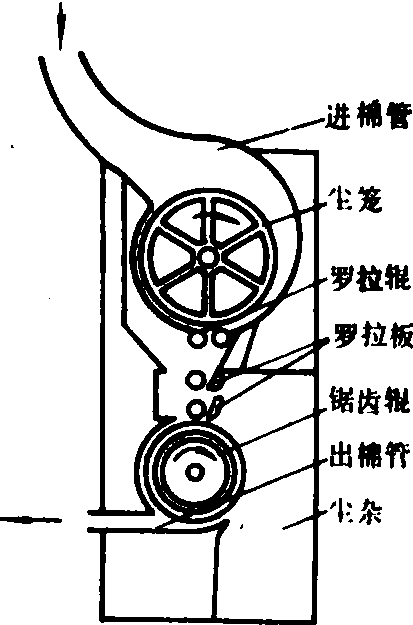 图2 锯齿式皮棉清理机 锯齿式皮棉清理机 亦称可控棉胎式皮棉清理机,结构如图2。皮棉输入尘笼后形成棉胎,尘笼带着皮棉旋转,被一对作相对转动的罗拉辊逐步向下输送,被第二组罗拉辊和罗拉板接住,再进行压实,棉胎减薄;然后经过第三组较高转速的罗拉辊和罗拉板使棉胎趋于均匀和减薄,同时起到梳刷纤维的作用。在锯齿辊筒高速旋转及离心力的作用下,杂质通过尘棒抛出,排落输送机外,皮棉则随锯齿辊筒转到出棉口被气流吸走。 锯齿辊筒直径一般在400毫米左右,线速度为18米/秒,尘棒与锯齿辊筒间隙可以调节,一般顶端0.8毫米,下端为4.8毫米。 清棉机cotton cleaner又称净棉机。清除机器采摘籽棉中所夹杂的泥土、铃壳、棉枝、碎叶等杂物,以提高棉花品质的机械。清棉机由多个尺寸及结构不同的锯齿滚筒和刷棉辊组成。工作时,待清理的籽棉被吸棉管送入清棉机,经锯齿滚筒多次拉绕及刷棉辊的梳刷,各种杂物分别落入杂物收集器中;清理过的籽棉被抛入棉箱,由螺旋推运器压出装袋。该机还能剥开棉铃取出籽棉。