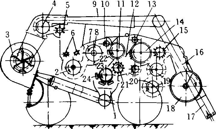 清棉机 1.排杂漏斗 2. 松棉除杂滚筒 3. 风扇 4. 大齿板滚筒 5. 真空阀 6. 喂料辊 7. 剥壳板 8. 剥壳滚筒 9. 扩散器 10. 铺棉小刷筒 11. 中锯齿滚筒 12. 阻隔板 13.拨花筒 14. 大锯齿滚筒 15. 上脱棉滚筒 16.漏斗 17. 吸棉管 18.压棉装袋螺旋 19. 碎叶清除滚筒 20.抛掷筒 21.下刷筒 22. 王分滚筒挡筛 23. 小锯齿滚筒 24. 刷子 |