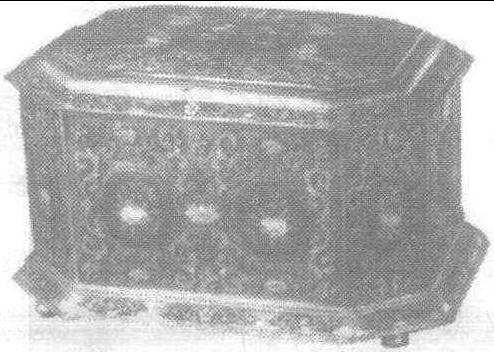 | 释义 | 清烧蓝五蝠捧寿八方盒系广州督抚为贺雍正皇帝寿诞之贡品。烧蓝即透明软珐琅,是珐琅工艺的一种。 系将透明珐琅料涂染在锤鍱隐起之金银器上,经低温烤熔而成。因其透明美观,且熔点低,容易烧制,故通行于民间。此盒高16.3厘米,口径16.9—25.4厘米。银胎涂金,八角形,平顶盖,削肩,用合叶与盒身相连,铆各色透明珐琅银片,棋子式四足。盖面饰海水江崖及五蝠捧寿。立墙饰勾莲纹。所填透明珐琅有宝蓝、浅蓝、浅绿、红、黄、紫多种。盒身八面有十个椭圆开光,镶玻璃,内衬彩绘折枝桃。盒盖内嵌装玻璃镜,供整容时用。盒内装有描金漆盒九个,其中墨绿地朱漆万寿园盒三个,朱红色描金蝙蝠形盒六个。此盒匠心独运,图案、色彩切合贺寿主题。