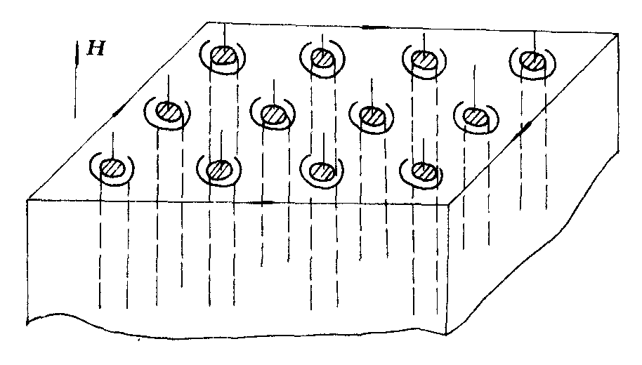 超导体按其磁化特性可分成两类,即第Ⅰ类和第Ⅱ类。这两类超导体的超导电性机制没有差别,但迈斯纳效应完全不同。第Ⅰ类超导体完全排除磁场,直到超导电性被突然破坏,然后被磁场完全穿透,只有一个临界磁场Hc,其磁化曲线如图1所示。当外加磁场H小于Hc时,超导体处在超导态,表现出完全的迈斯纳效应,称超导体处于迈斯纳态;当外加磁场H≥Hc时,超导体处于正常状态。绝大多数元素超导体为第Ⅰ类超导体。但它们的临界磁场太低,作为超导磁体的线圈没有什么应用价值。第Ⅱ类超导体有两个临界磁场,即下临界磁场Hc1和上临界磁场Hc2,其磁化曲线如图2所示。只要外磁场H>Hc2,第Ⅱ类超导体不具有超导电性。当外磁场Hc1和Hc2之间,第Ⅱ类超导体处于混合态,体内有磁力线穿过,这些磁场不为零的区域形成许多半径很小的圆柱形正常区,其周围是连通的超导区,超导区的表面仍存在抗磁超导电流,如图3所示。显然,在正常区内磁场和电阻率都不为零,在超导区内都为零。这样,第Ⅱ类超导体处于混合态时,既具有不完全的抗磁性(体内存在H≠0的正常区域),又保持零电阻性(存在连通的超导区域)。所以,这时的迈斯纳效应是不完全的。当外磁场增加时,圆柱形的正常区域大小不变,但数目增多。当外磁场增大到Hc2时,相邻的正常区域彼此接触,超导区域随之消失,于是整个超导体转变到正常态,被磁场完全穿透。在现有的超导体中,铌(Nb)、钒(V)、锝(Tc)以及大多数合金和化合物超导体都属于第Ⅱ类。