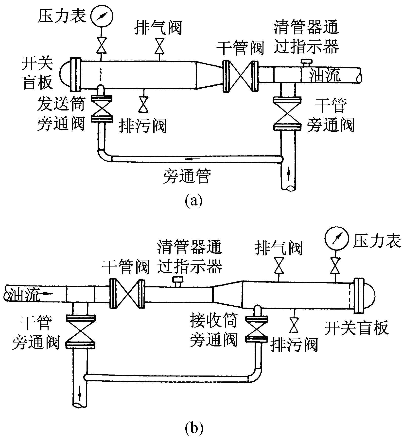 | 释义 | 清管器收发装置pig launcher and receiver trap发送和接收清管器的阀组等设施。下图为其示意图。发送时,先打开盲板把清管器放入发送筒内,逐渐开启原处于关闭状态的发送筒旁通阀和干管阀;逐渐关闭原为开启的干管旁通阀,靠油流压力将清管器从筒内推入干管;当指示器上指示清管器确已通过后,将各个阀门复原。接收时,先打开干管阀及接收筒旁通阀,再逐渐关闭干管旁通阀,待确认清管器已掉入接收筒内后,将各个阀门复原,打开排气阀及排污阀泄放筒内的压力及污油,然后打开盲板取出清管器。