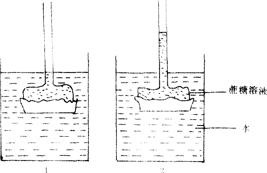 图539 渗透现象 1.实验开始时 2.经过一段时间 是溶剂分子通过半透膜的扩散作用。如图539在长颈漏斗口上紧扎着一块半透膜,漏斗内装有蔗糖溶液,将漏斗倒置于盛有纯水的烧杯中,开始漏斗内外液面相等。由于纯水的水势高,蔗糖液的水势低,所以烧杯中的水就会通过半透膜向漏斗内移动,漏斗内液面上升。溶液上升到一定高度后就不再上升。这一现象就是渗透作用。因此渗透作用是水分从水势高的系统通过半透膜向水势低的系统移动的现象。渗透作用的发生需要有两个条件: 一是半透膜,一是半透膜两边有水势差、成熟的细胞含有大液泡,液泡中有一定浓度的细胞液,液泡外是原生质层,在讨论细胞吸水时,常把它当作一半透膜。这样一个细胞放在水或溶液中时,如果原生质层两边有水势差,就具备了进行渗透作用的条件。当外界溶液水势高于细胞液的水势时,细胞就通过渗透作用吸水。一般情况下,土壤溶液的水势是比较高的,因此根系可从土壤中吸水。但当外界溶液水势低于细胞液的水势时(如一次施用过量的化肥),细胞不仅不能从外界吸水,反会使细胞中的水分外流,从而造成对植物不利的影响。由于一株植物的全身细胞大都是成熟细胞,所以植物吸水,以渗透吸水为主。 |