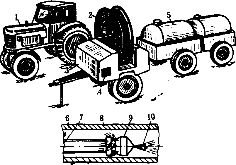 1.拖拉机;2.软管滚筒;3.泵;4.发动机;5.水箱;6. 暗管;7.软管;8. 后冲水流;9.喷嘴;10.前冲水流