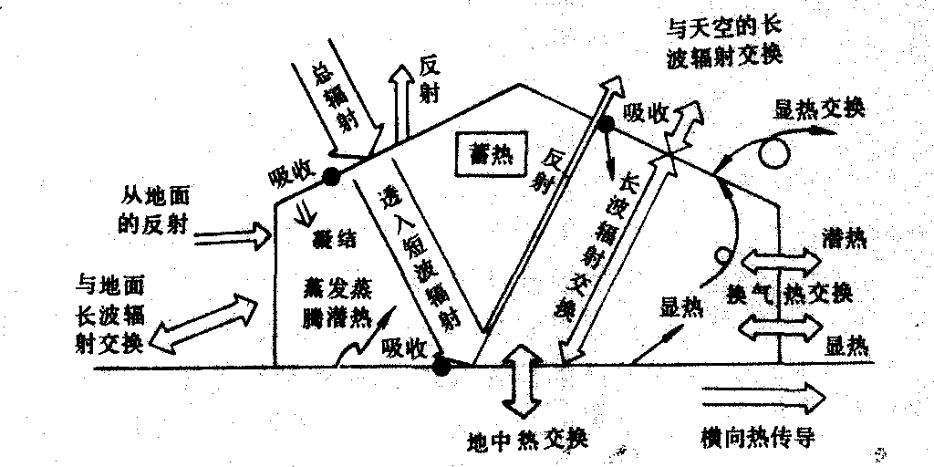 无人工调节温室的热量平衡如图1所示。白天,太阳总辐射是主要能源,它到达覆盖表面后,部分被反射和吸收, 大部分透射入室内到达地面和作物面,还有一部分由地中横向传出室外。夜间, 温室散热降温, 室内温度的维持主要靠白天地中的蓄热并通过地面辐射和乱流交换提供热量。温室内地面净辐射R内地比室外低, 显热交换P与潜热交换LE也减少, 而土壤热交换B则比室外多, 因此室内地温比室外高。由于覆盖减少了热扩散, 室内气温也提高。温室整个覆盖面的热量平衡表达式为 R外-R内=P内+P外+LE内 式中 R外、R内为温室覆盖外表面与内表面的净辐射;P内为温室覆盖内表面与室内空气的乱流热交换; P外为覆盖外表面与室外空气间的乱流热交换;L E内为覆盖内表面凝结的水量乘以蒸发潜热。
