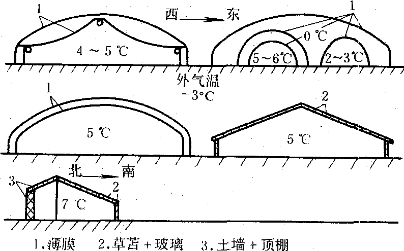 图 1 无加温温室的辐射平衡与热量平衡示意图 要素分布 辐射 温室内的照度一般只有室外的50%~80%,冬季往往成为作物生长的限制因子之一。影响光环境的主要因素是太阳辐射、温室结构、覆盖材料的光学特性和作物的群体结构。温室对太阳直接辐射和散射辐射的透过率是不同的。透过率取决于温室的形式、结构与覆盖材料的种类, 而温室的方位和太阳在天空中的位置一般只影响太阳直接辐射的透过率。散射辐射的透过率可看作是温室固有的常数。透过率 一般是南部优于北部, 上部优于下部。就直射光平均透过率而言, 冬季全玻璃透明温室的透光率东西走向比南北走向要高,两者相差5%~25%(平均约7%~10%),即使方位偏转30°也是这样。温室愈长、高跨比(高度/跨度)愈小、纬度愈高、温室的太阳辐射透过率也愈高;春秋季,两者差异小于5%;但夏季, 南北长温室的透过率反比东西长的高。东西长温室内, 辐照度的水平分布不均匀, 有明显的低值区, 中午时透过率比早晚的高5~10%; 南北长温室则相反,水平方向上辐照度较均匀, 中午的透过率比早晚的低。温室顶部玻璃的坡度对太阳直接辐射透过率影响很大, 冬季, 随坡度增加, 东西长透过率明显增大, 平均透过率最大的坡度, 大体等于该地当日正午太阳高度角; 但夏季则随坡度增加反而略减。无论冬季或夏季, 南北长的温室太阳辐射透过率随顶面坡度变大而减小。散射辐射透过率随顶面坡度减小而增大,可相差2%~3%,地面中央部位比四周约高5%~8%。一面侧墙不透明时, 附近地面上的散射辐射透过率减少30%。温室构架厚度所形成的阴影对南北长的太阳辐射透过率影响很大,对东西长的影响则在早、晚大,中午较小。构架的阴影是冬季形成低值区的主要原因。 覆盖材料的光学特性对温室的光质光量影响很大。聚氯乙烯和玻璃对短波辐射的透过率都在80%以上, 对长波辐射几乎不能透过。具有特殊透射光谱的有色薄膜和玻璃, 能改变室内辐射成分而影响作物生长和品质。玻璃几乎不透紫外线, 对作物花果着色等有显著影响; 塑料薄膜能吸收紫外线, 使紫外线透过率明显下降。塑料薄膜吸附尘埃、水滴和老化后, 透光率即显著下降。覆盖材料对太阳直接辐射的透过率随太阳辐射对覆盖材料的入射角增大而明显减小。入射角为0°~40°时,反射率大约为7%~8%;40°以上时反射率急增,至60°以上时, 玻璃和薄膜变得几乎不透明。入射角为30°~60°时,半透明散射性覆盖材料比透明材料的透过率低,但使温室内散射辐射比例增大,地面上的辐照度比较均匀。 温度 室内温度随外界气温变动而有明显的日变化和季节变化。不加温的密闭温室, 白天室内外温差随太阳辐照度增加而加大, 室内气温可比室外高2倍以上; 夜间室内最低气温一般比室外高1~4℃, 有时比室外低, 因此昼夜温差很大。室内温度状况随温室的保温比、通风换气状况、潜热消耗和覆盖材料的辐射特性等而有显著变化。温度的垂直分布和水平分布不均匀,室内各部位之间温差最大可达5~8℃。密闭温室内部,上风侧常比下风侧温度高。这是因为在屋顶部分上风一侧形成负压,下风一侧形成正压,造成室内气流方向与外界风向相反,使被加热的空气沿地面流向上风一侧所致。室内白天地表温度低于气温,温室中部地表温度比室内四周略高。在冷季,室内覆盖地膜提高贮热比(土壤贮热量/地面净辐射),或在温室四周设防寒沟减少地中横向传导散热,都能提高室内土温和气温。在冬天微风的晴夜,温室内气温有时比室外还低。温室愈小、白天的太阳辐射愈少、夜间温室有效辐射愈大时,愈容易出现这种情况。土壤贮热量愈多,保温比愈大,这种现象愈难出现。微风时,室外贴地层可以通过空气的垂直乱流和平流由上层或其他地方补给热量,温室内不仅得不到这种热量的补给,反而由于温室强烈的辐射冷却,形成了室内比室外气温低的现象。保温覆盖能减少温室散热而提高夜温。不同种类覆盖的保温作用约为2~10℃,见图2。