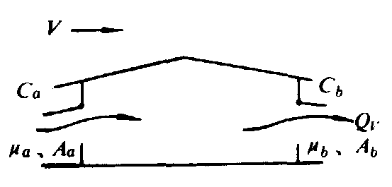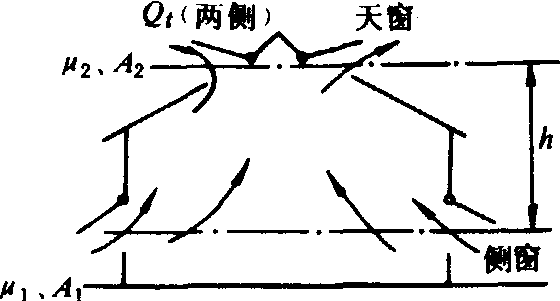 图2 风压通风 在实际温室应用中,往往是热压与风压同时作用,在多层窗中进行通风。在热压与风压同时作用时,多层窗的换气是由各窗孔的位置、形状、面积、风速及内外温差决定的。整个温室的通风量是指所有窗孔总进气量或总的出气量。如图3所示,多层窗在热压与风压共同作用下,各窗孔的流量系数、过流面积、风压系数分别为μi、Ai、Ci,则通过各窗孔的流量Qi,由下式确定: