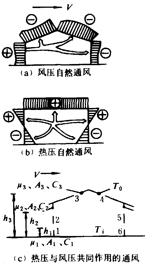 图1 热压通风 因风力造成对建筑物外表面的压力,称为风压。风向一定时,某 一确定部位的风压与风速动压成正比,由风压造成的通风流向如图2所示。