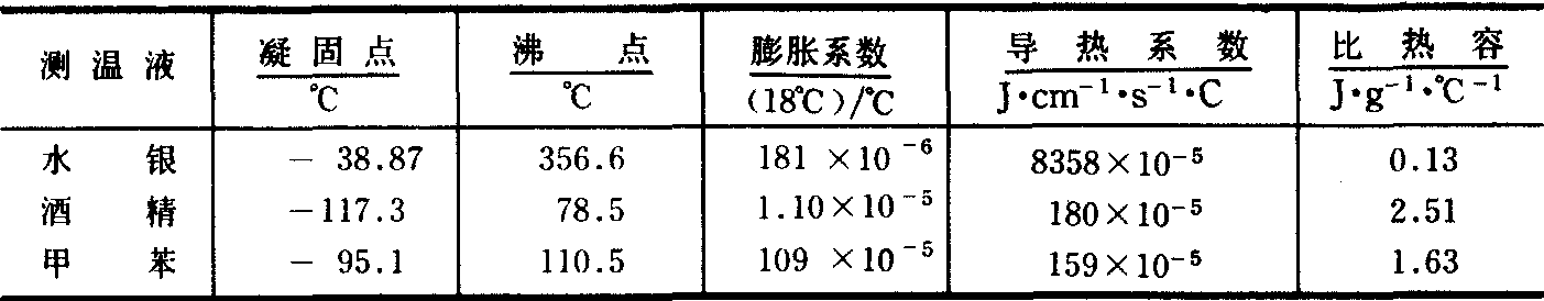 玻璃液体温度表 测温物质是液体、球部和管壁由玻璃制成的各种温度表的总称。玻璃液体温度表的感应部分是一个充满液体的玻璃球。一根中空的玻璃毛细管与它相通,毛细管的另一端密封。常用的测温质是水银、酒精或甲苯,它们的物理性质对比如表2。