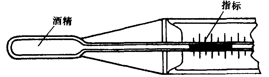 ❷最低温度表(图3)。它可指示一定时间内的最低温度。其构造特点是在酒精液柱中置有一哑铃形指标。当温度降低时,液柱收缩。液柱顶的表面张力将指标拉向低示度; 当温度上升时, 膨胀的酒精绕过指标而不冲动指标原有的位置。这样, 离球部较远一端的指标位置就指示出自上次调整以来的最低温度。每次调整时只需将球部抬高, 使指标落到液柱顶端即可。
