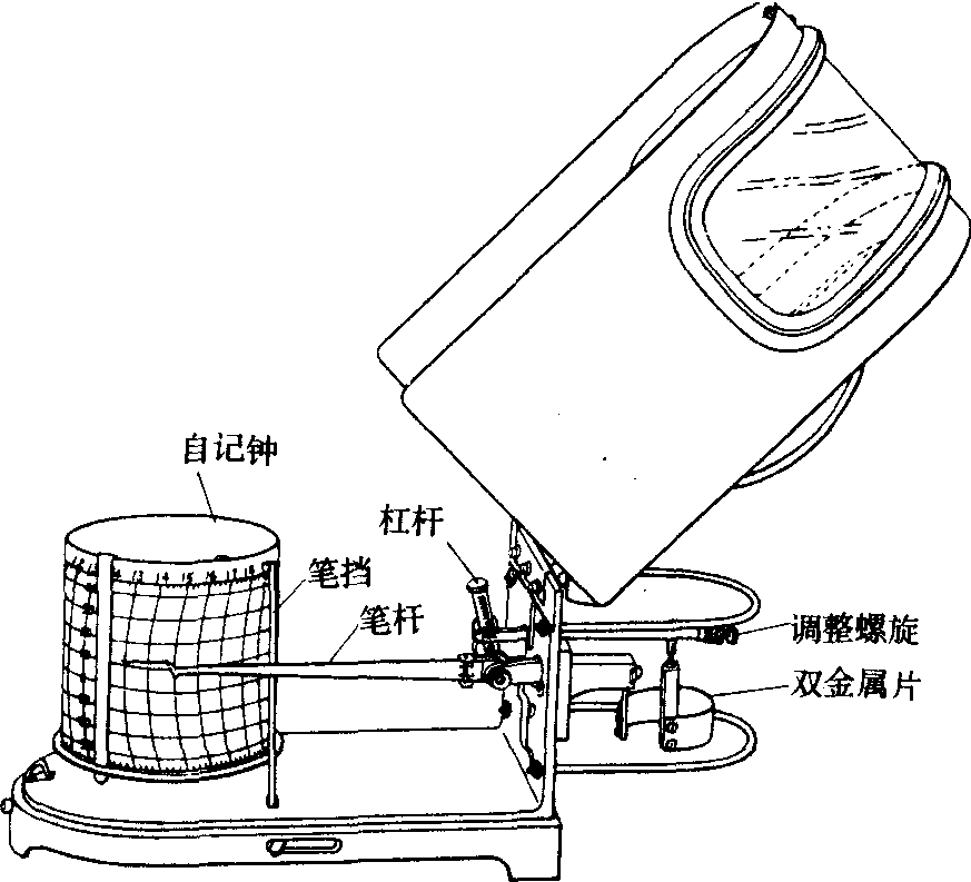 双金属片温度计 如图6,它能连续记录温度。其感应部分一般是由两种膨胀系数不同的金属片焊接而成的双金属片。 其曲率随温度而变化; 它的一端固定,另一端的位移通过杠杆的放大传递,使记录笔在钟筒的自记纸上记录下温度的连续变化。钟筒旋转一周为一日(日转型)或一星期(周转型)。温度计由于机械摩擦等原因而造成的误差一般可达0.5℃或以上,使用时应对照温度表读数进行记录订正(见温度、温度测定仪器)。