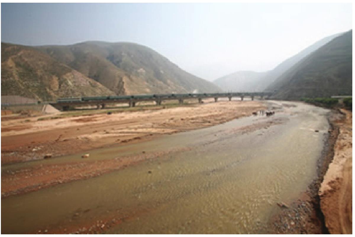 渭河麦积段 渭河黄河最大支流。发源于甘肃省东部渭源县鸟鼠山, 东流至宝鸡进入陕西省,横穿渭河平原,于潼关县入黄河。全长818公里, 流域面积134934平方公里。北岸支流源远流长, 有葫芦河、千河、漆水河、泾河、石川河、北洛河等,以北洛河和泾河为最大支流。南岸有石头河、沣河、浐河、灞河等湍急短小支流,呈不对称水系。渭河南有秦岭横亘,北有陇山、北山屏立。宝鸡峡以西为黄土丘陵沟壑区,以东为关中平原。泾河口以上是游荡性河型, 以下为弯曲性河型。径流变幅大,年径流量75.7亿立方米。年输沙量华县测站4.25亿吨,来自山区和黄土高原丘陵区,6~9月份输沙量占全年的88.5%以上。渭河流域灌溉事业发展很早,西汉武帝时在眉县东北兴建成国渠,经武功、扶风、兴平、咸阳入渭,灌田数万顷。还有灵轵渠以及上游许多小型水利工程。1935年兴建的渭惠渠大致沿成国渠旧迹。历史上渭河曾为重要的交通运输线和军事航道。春秋时期(公元前647年)的“泛舟之役”即指秦国粮食由渭河、黄河、汾河运至晋国。秦末项羽和刘邦在河南荥阳相持作战,汉军的军粮经由渭河、黄河运到河南。东汉隗嚣割据陇山以西,刘秀还曾乘桃花水涨时,用船运军需物资到陈仓(今宝鸡市)。公元471年刘裕伐秦,王镇恶由潼关率水兵向长安进军,乘朦艟小船(战船)经渭河直达长安城北门外的渭桥攻陷长安。汉唐时,潼关到长安河段为运粮航道。我国东南物资主要由黄河入渭水转入长安。汉代还在黄、渭交汇处附近置船司空(后改为县名),负责调度上下船只。当时设立的华仓遗址就在今华阴县东10公里㟪峪瓦碴梁。长安到宝鸡亦曾有航运之利。今因泥沙淤浅和涨落不定,以及陆运发展,渭河已无船运之利。 渭河黄河主要支流。流经甘肃省中部,东南部和陕西省的中部。有二源:南源清源河,源于渭源县西南豁豁山,汇集山区众多支流,为常年性河流,长30多公里, 东北流至渭源县清源镇与西源合; 西源名禹河,源于渭源县西鸟鼠山,河流短小,为间歇性河流,东流与西源合后始称渭河。东流过陇西县,再东南流入武山县,南岸有榜沙河、山丹河、大南河汇入。再东流入甘谷县,北岸有散渡河注入,至天水市又有葫芦河由北岸注入,耤河由西来汇,再东汇牛头河,过小陇山,入陕西省境。再东流经宝鸡、咸阳、渭南等地。北纳千河、泾河、洛河,南汇秦岭北坡诸水,至潼关入黄河。全长818公里,流域面积13.48万平方公里。甘肃省内长360公里, 流域面积2.56万平方公里,年径流量24.9亿立方米,流经黄土高原,水土流失严重,年输沙量1.41亿吨,最大含沙量每立方米953公斤。是黄河泥沙主要来源之一。 渭河属黄河的一级支流,也是黄河中游地区的第一大支流。发源于甘肃省渭源县西南海拔2609米的鸟鼠山,流经甘肃渭源、陇西、武山、甘谷、天水;陕西宝鸡、武功、兴平、咸阳、西安、临潼、渭南、华阴、潼关等24个县市,于潼关港口注入黄河。渭河全长818公里,全流域面积62440平方公里,多年平均径流量94.3亿立方米。1990年平均流量112立方米/秒。