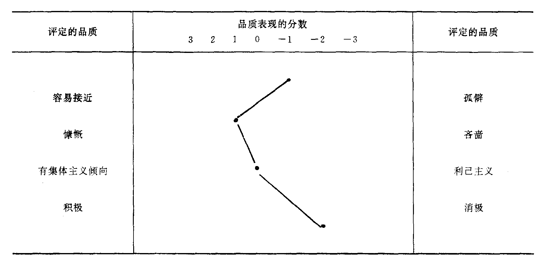 | 释义 | 个性品质两极鉴定法gexing pinzhi liangji jianding fa社会心理学研究人的个性品质采用的评价问卷方法。它是德国心理学家吉布施弗威尔格和高夫斯坦德尔创导的。这种方法不仅能揭示被试者有哪些个性品质, 而且还能形象地揭示出被试者的这些个性品质所表现的程度。具体的运用方法是:主试先发给群体成员每人一份标准化的个性品质两极评定量表,要求他们给某被试者的个性进行鉴定(见下表),然后再将结果集中加以统计处理, 并作出被试者个性品质的鉴定结论。