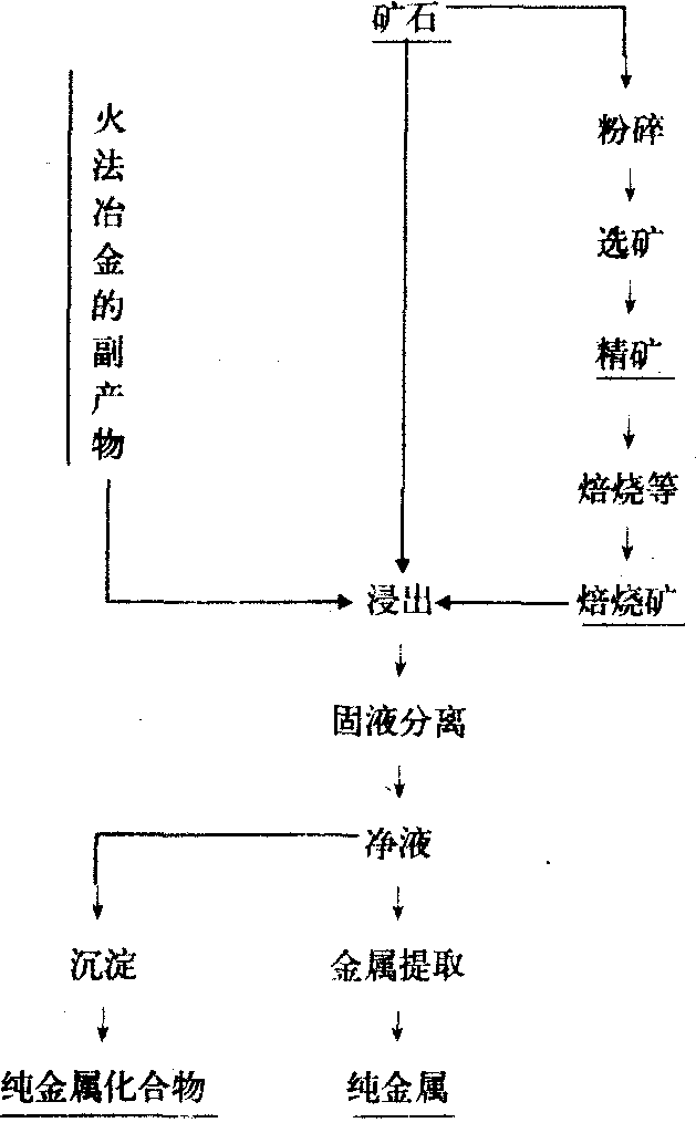 湿法冶炼的工艺流程示意图 ❶预处理 矿石经粉碎、选矿、化学处理 (如焙烧等),以除去脉石,增大反应表面积,转化为易浸出的化合物等; ❷浸出 使矿石或精矿中的目的金属溶于溶剂中; ❸液固分离 从浸出液中除掉不溶性残渣等固态物质; ❹净液、浓缩 用化学方法从浸出液中除去杂质,如有必要可提高有价金属的浓度; ❺金属提取或化合物沉淀 利用电解等还原法从浸出液中提取目的金属,或者通过调节pH值、添加沉淀剂等,使纯净的化合物沉淀出来。湿法冶炼的工艺流程见图。湿法冶炼一般适用于以下情况: ❶原矿的目的金属难以富集,或富集成本高,如用火法冶炼需大量燃料,又产生大量熔渣; ❷ 目的金属的化学活性强,不可能进行火法冶炼; ❸从产品纯度、废气处理、副产品等几方面综合判断,湿法更为有利的情况。湿法与火法相比,金属回收率高,原料综合利用可能性大,可以直接处理难选或难熔的贫矿,燃料消耗少,作业易于控制,劳动环境好。但工艺和设备都比较复杂。随着离子交换等新技术的应用,湿法冶炼应用愈来愈广。现在世界上80%的锌锭是采用湿法生产的,其纯度可高达99.997%以上 ,且比火法冶炼容易采取环境保护措施。金和银大多采用湿法冶炼。 |