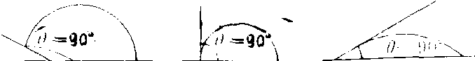| 释义 | 湿润性wetting液体与固体表面结合形成液固界面的现象。当液体落在固体表面上时,发生液体与固体之间的亲和力大于气体与固体之间亲和力,液体驱逐吸附在固体表面的气体,而形成新的液固界面。液体之所以能够在固体表面上展开,表明湿润过程中包含了展布(spreading)现象。湿润的程度可以用液固界面形成的接触角θ的大小来表示。若θ>90°表明液体不能在固体表面湿润,如固体表面稍加倾斜,液体必然滚落。θ=90°时液体不能展布,θ<90°时液体湿润且展布较大面积。
