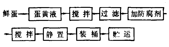 采用添加防腐剂的方法,将鲜蛋蛋黄液加工成具有良好贮存性的制品的过程。中国只少量生产供食品工业用的新粉盐黄(以苯甲酸钠为防腐剂)和供工业用的老粉盐黄(以硼酸为防腐剂)。湿蛋黄加工的工艺流程如下: